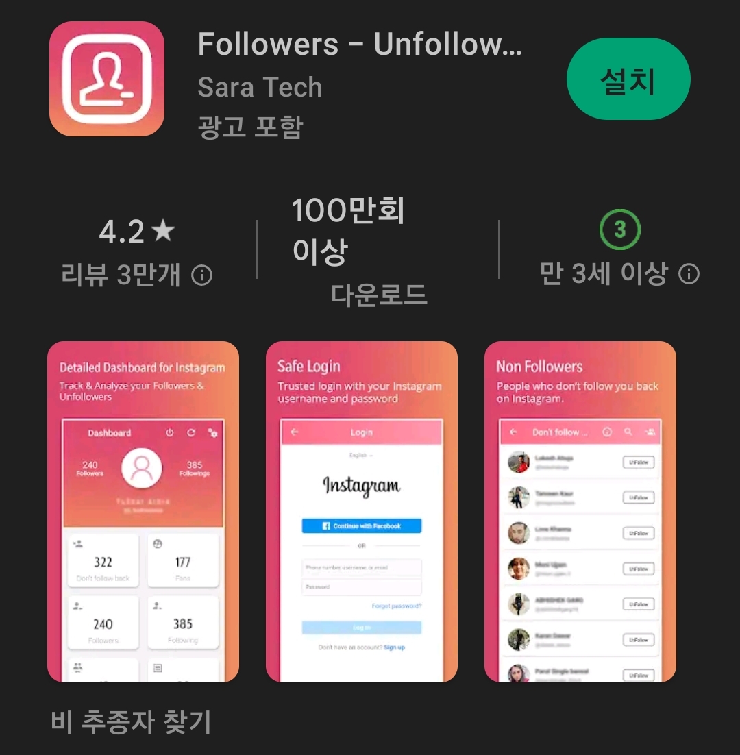 인스타그램 맞팔 확인해주는 앱은 정말 많다. 구글 플레이스토어나 앱스토어에 인스타 맞팔만 검색해도 앱 수두룩 뜬다. 하지만 어떤 앱이 당신의 개인정보를 갈취하고, 어떻게 이용할지 모른다. 그러므로 아무거나 설치하지 말고 무조건 사람들의 리뷰를 꼼꼼히 봐야한다.
