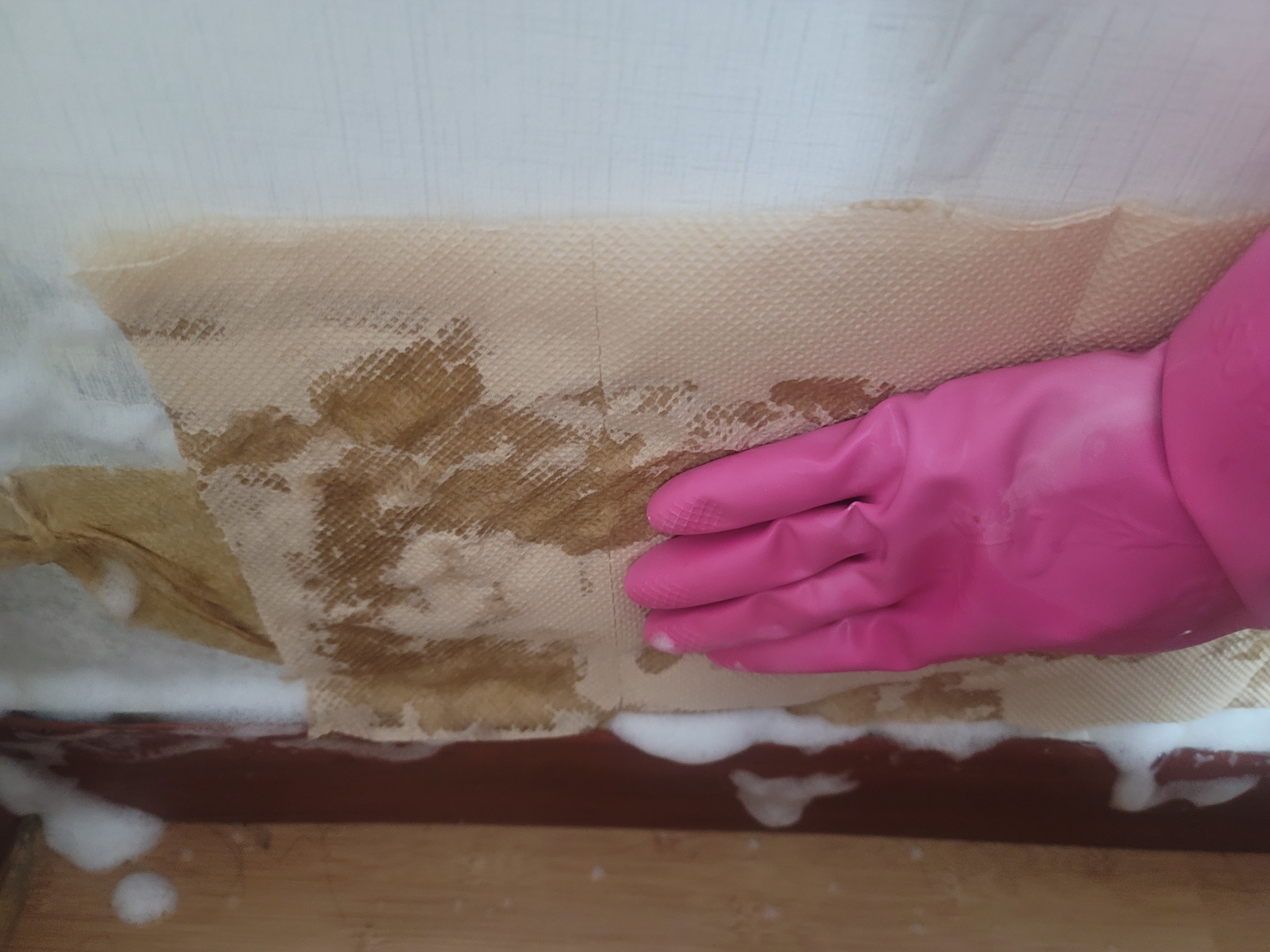 그 후 락스가 마르지 않도록 키친타올을 덮어준다. 나는 갈색 키친타올을 사용했는데, 무색 흰색 키친타올을 사용하자!! 갈색 키친타올로 락스를 덮으면 벽지에 갈색이 물든다.