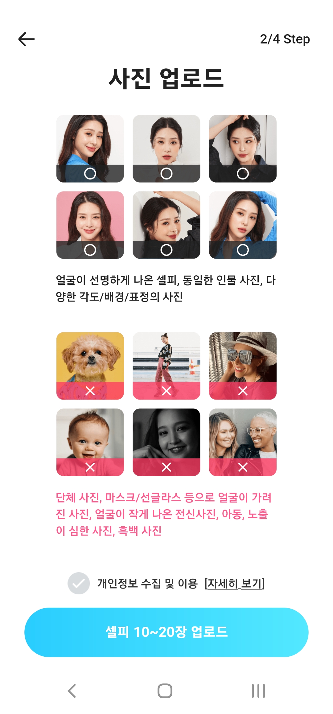 그래서 스노우 앱은 돈을 아끼고자 여러분들에게 작품을 만들어주고, 여러분들의 데이터를 기반으로 AI 아바타 학습시키겠다는 것이다. '개인정보 수집 및 이용' 동의를 누른 후에는 셀피 10~20장을 업로드할 수 있다.