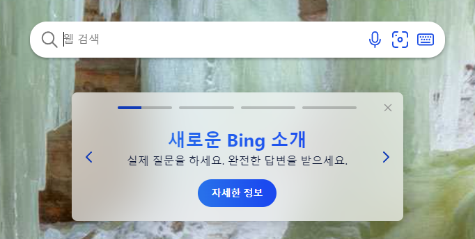 사용하는 방법은 간단한데, www.bing.com 사이트 접속하면 가운데에 새로운 Bing 소개라는 항목이 보인다. Chat gpt를 도입했다고 소개하는 것임.