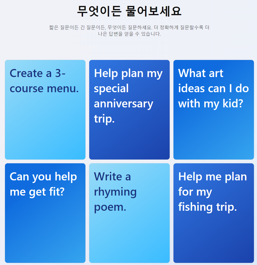 실제로 들어가보면 무엇이든 물어보세요 란에 예시 질문들이 있고, 이 질문들을 클릭하면 Bing에서 챗 Gpt가 어떻게 대답을 하는지 오른쪽에 채팅처럼 나온다.