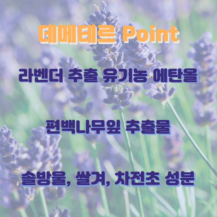 피부 성분으로는 라벤더 추출 유기농 에탄올, 편백나무잎 추출물, 솔방울, 쌀겨, 차전초를 사용했어요.
