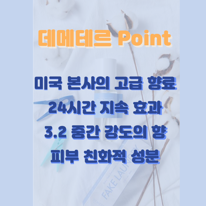 데메테르에서 적어두었듯이 방금 빨래한 듯한 옷에서 나는 향입니다. 피죤 섬유유연제랑 비슷한 향 같기도 해요.