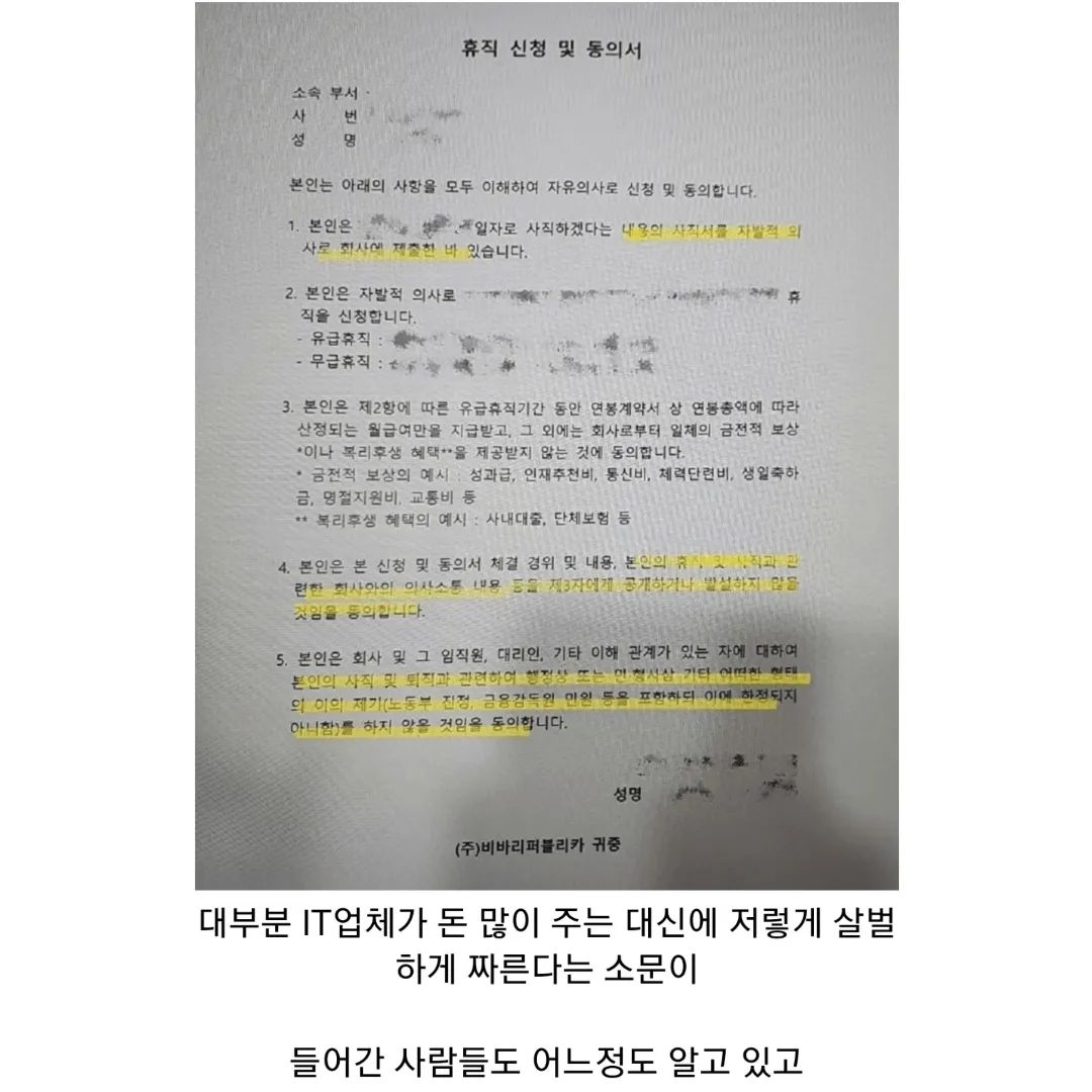 IT 업체가 돈을 많이 주는 대신 고용 유연화를 추진하는 것 아니냐는 의견도 있다. 위와 같이 비바리퍼블리카 회사에 제출하는 휴직 신청 및 동의서가 있다고 하는데, 이게 권고사직인 듯...