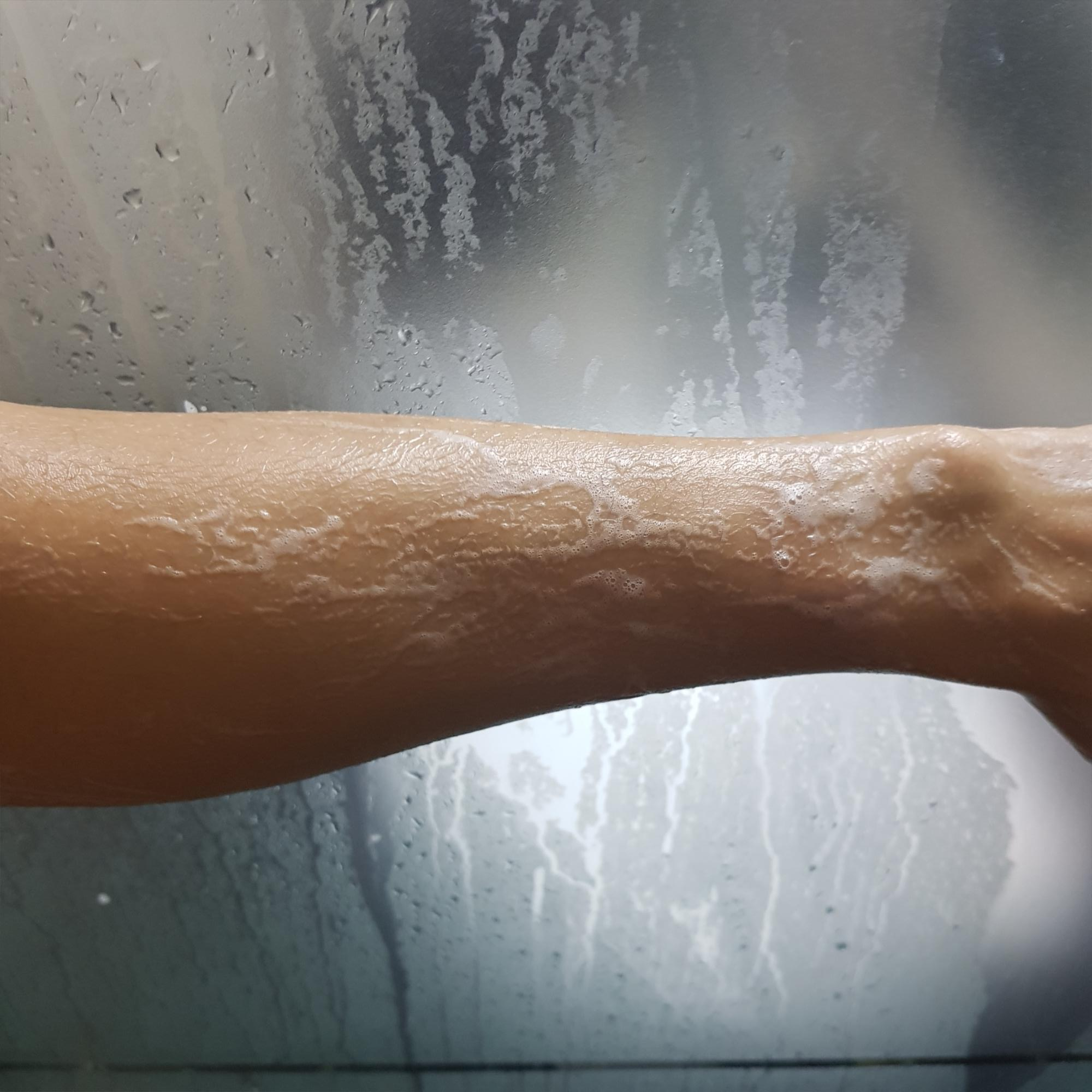 직접 샤워할 때 찍은 사진입니다. 일상적으로 사용할 땐 아까만큼 거품이 많지는 않더라구요. 수시로 물이 뿌려져서 그런가봐요. 팔에는 작은 거품들이 거품거품하게 있어요.
