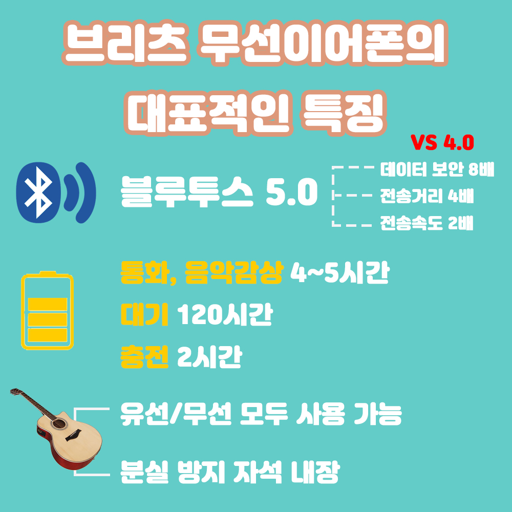 일단 블루투스 5.0이라서 4.0버젼보다 전송거리가 4배, 전송속도가 2배나 늘어났습니다.