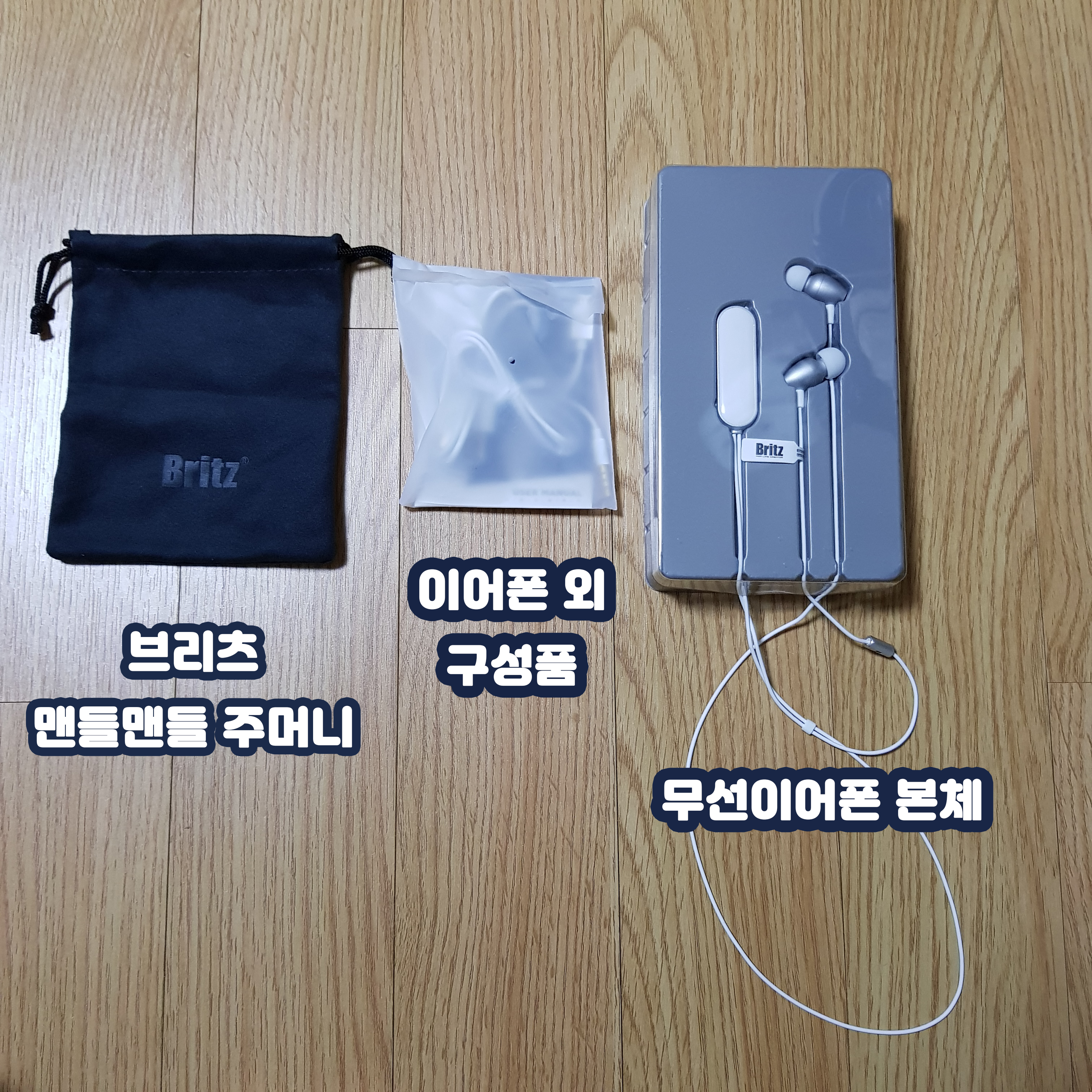 구성품을 보시면, 뭔가 담으라고 준 맨들맨들 주머니와, 이어폰 외의 구성품, 무선이어폰 본체가 있습니다.