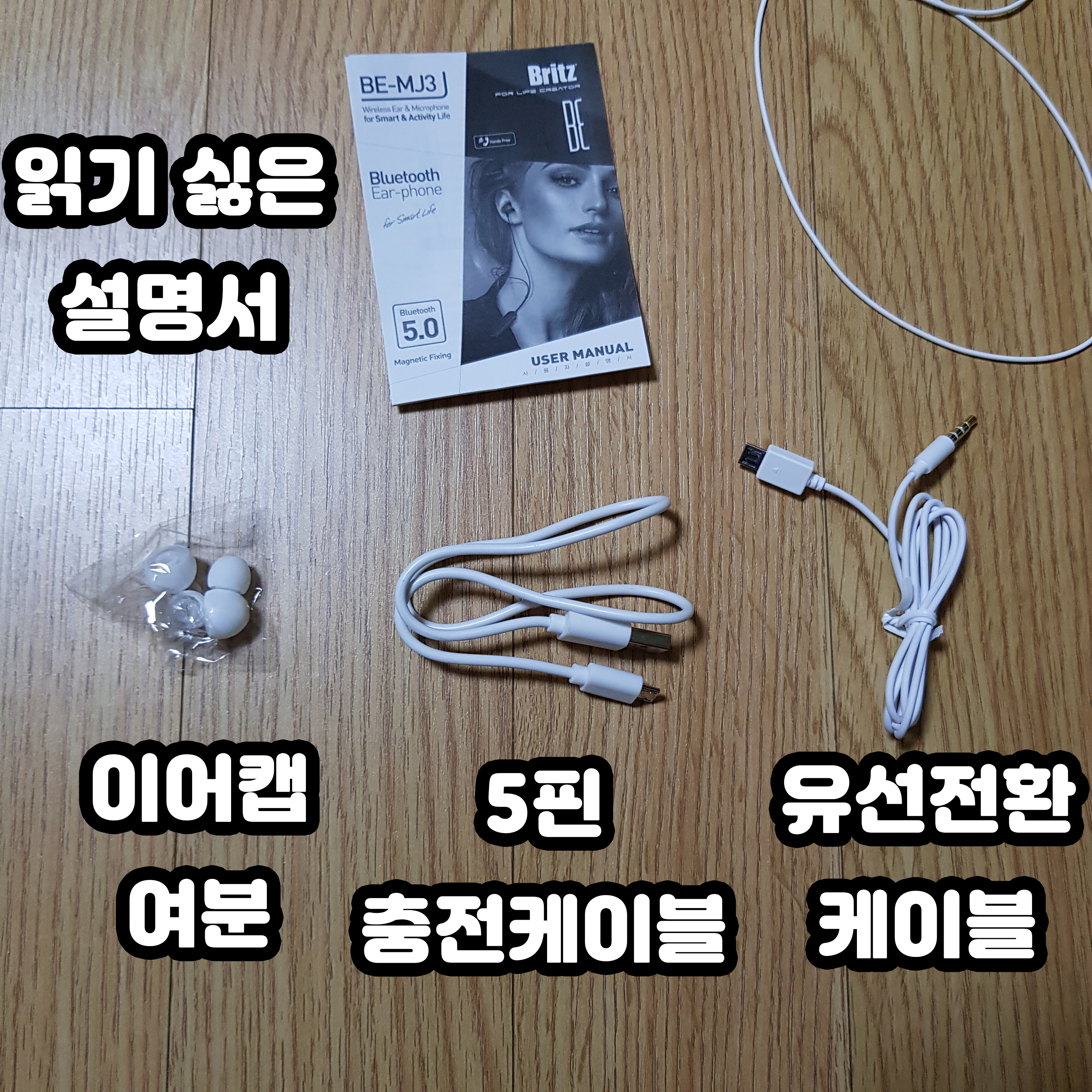 설명서와 이어캡 여분, 5핀 충전케이블과 유선 전환 케이블이 있어요.