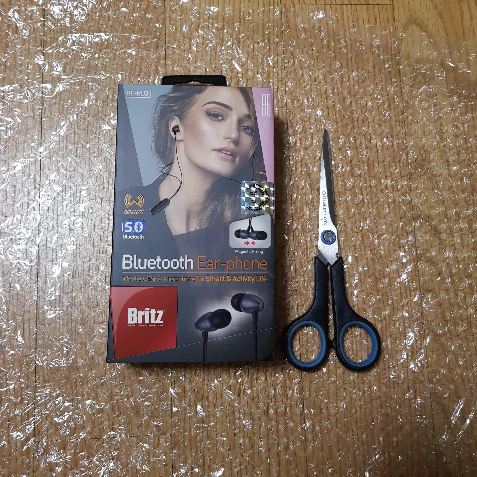 박스를 뜯으면 가위보다 살짝 큰 블루투스 이어폰의 박스가 나와요.