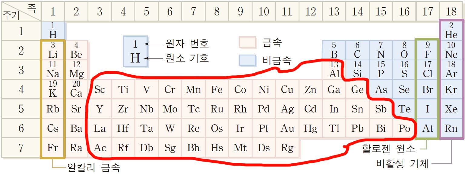 등등 빨간색으로 동그라미 친 애들이 금속이다.