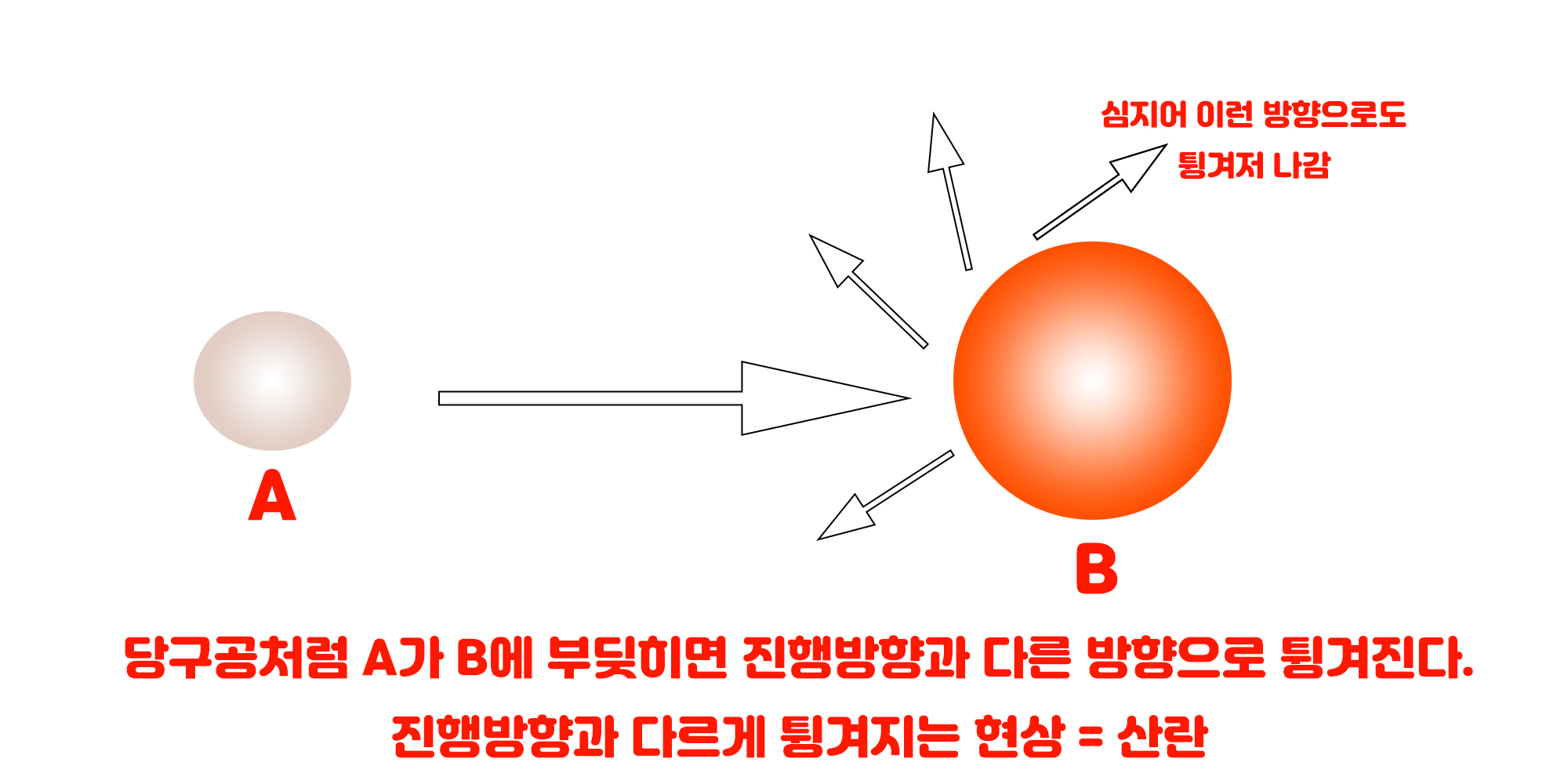 위 사진에서 A가 큰 화살표 방향대로 진행을 하면 B와 부딪힙니다. B와 부딪히면 작은 화살표 방향들로 튕겨져 나가겠죠. 산란은 진짜 어느 방향으로 튕길지 모릅니다. 당구 허졉이 눈감고 당구공 친다고 생각하시면 돼요.