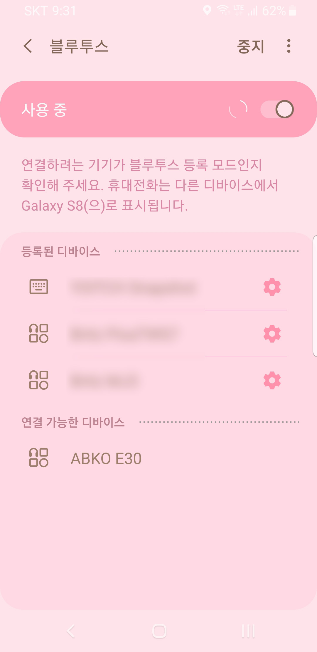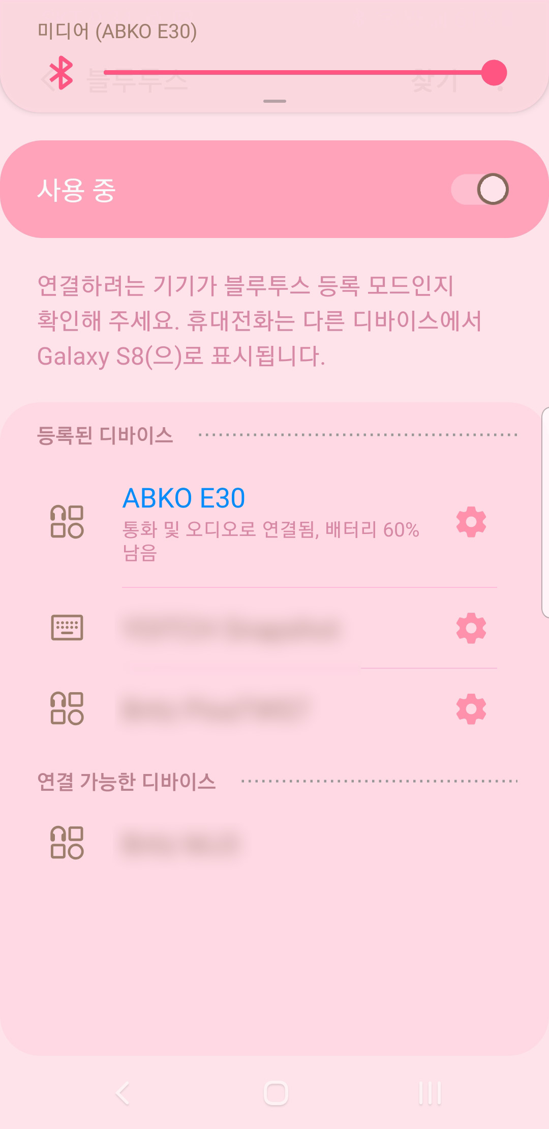 이 때 스마트폰의 블루투스를 키고, ABKO E30이라는 디바이스와 연결하시면 됩니다.