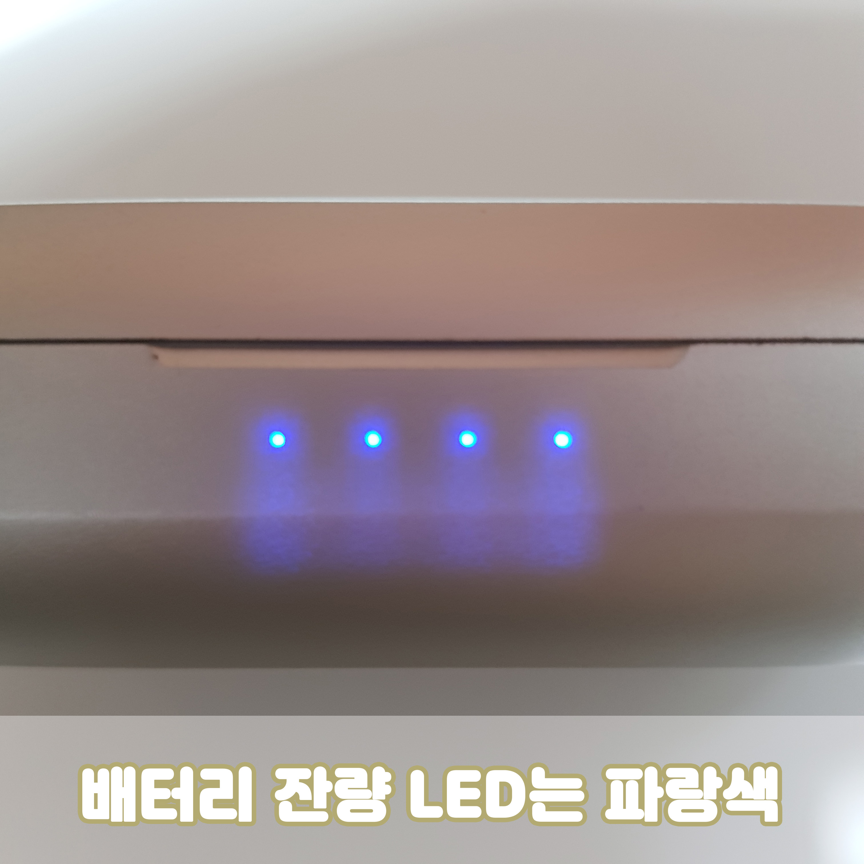 배터리 잔량 LED는 파랑색이구요. 상당히 밝은 편이라 잘 때 침대옆에 두면 수면에 방해됩니다.