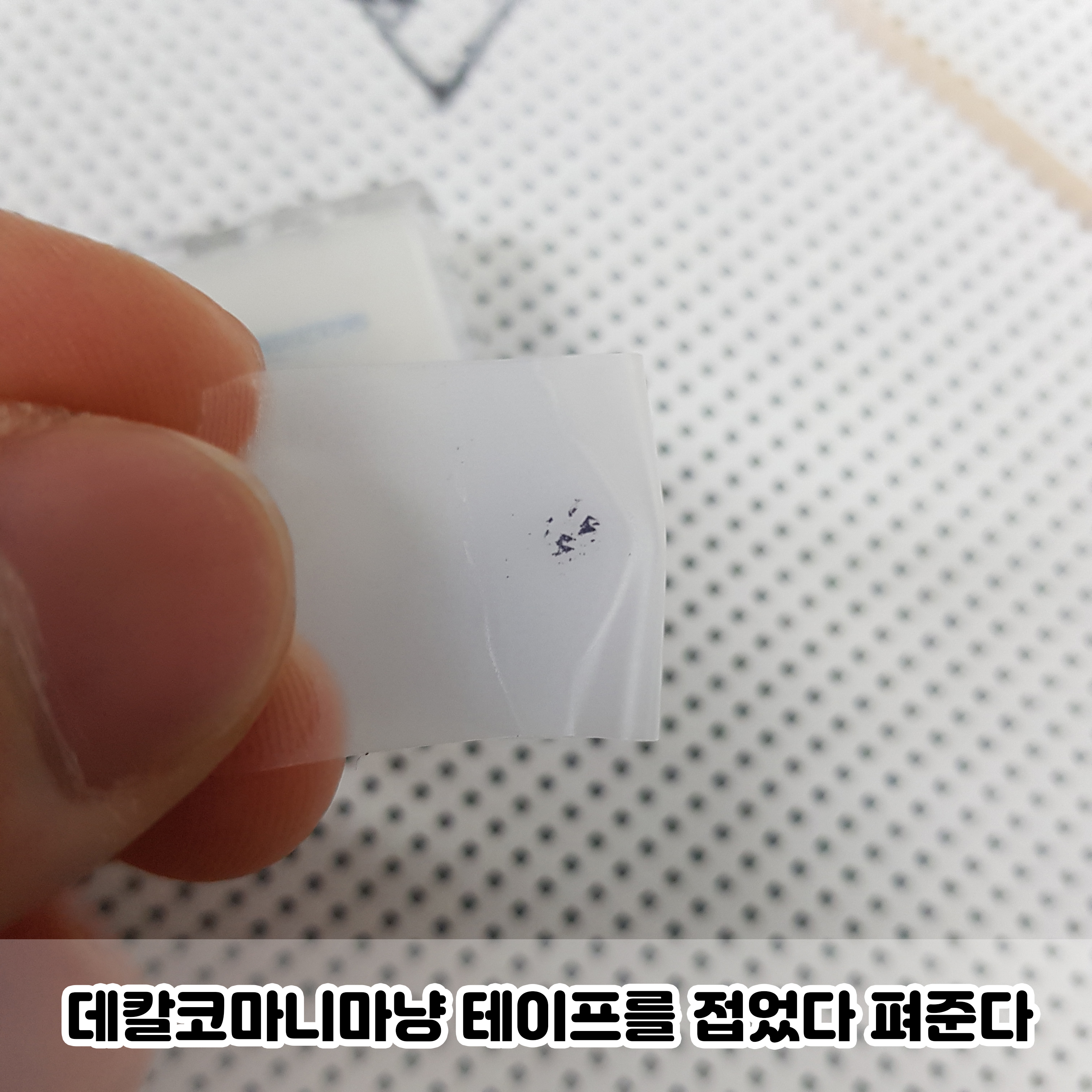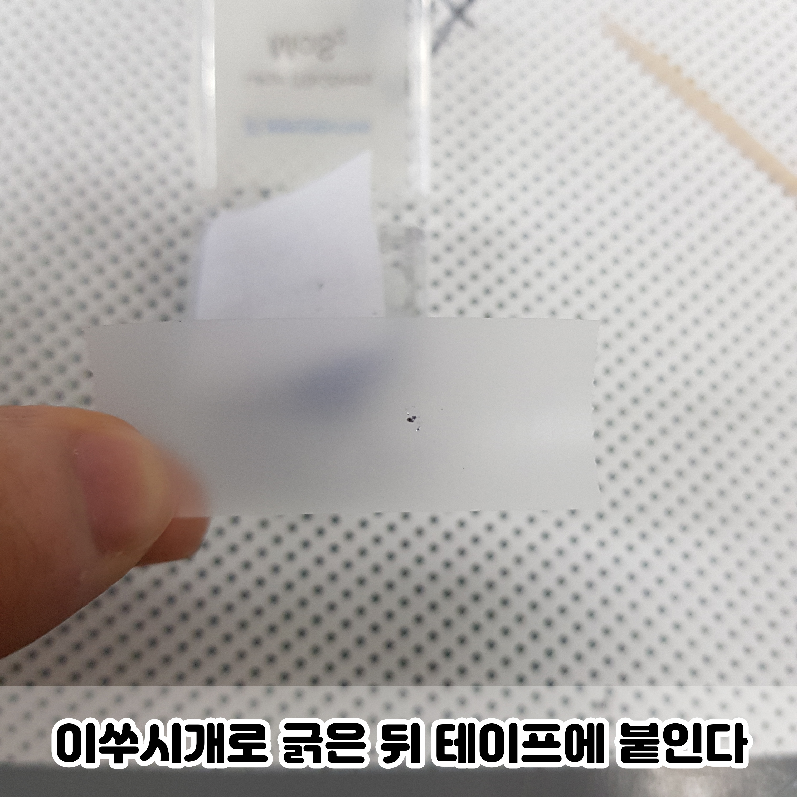 이제 테이프를 반으로 접었다가 펴주세요. 테이프를 붙일 때 손으로 문질문질 힘을 줘서 눌러줘야합니다.
