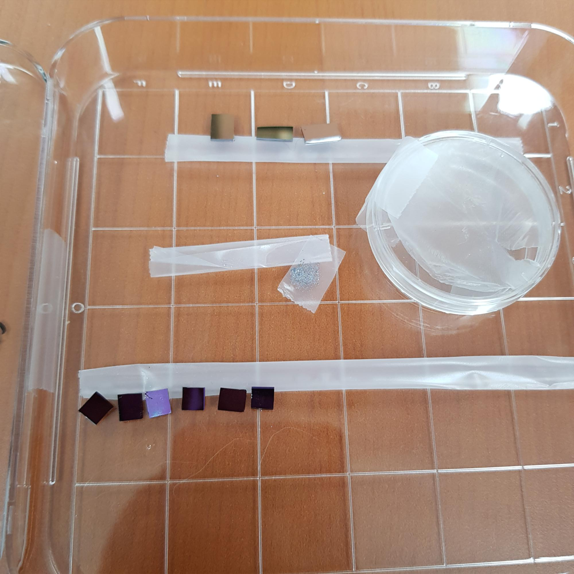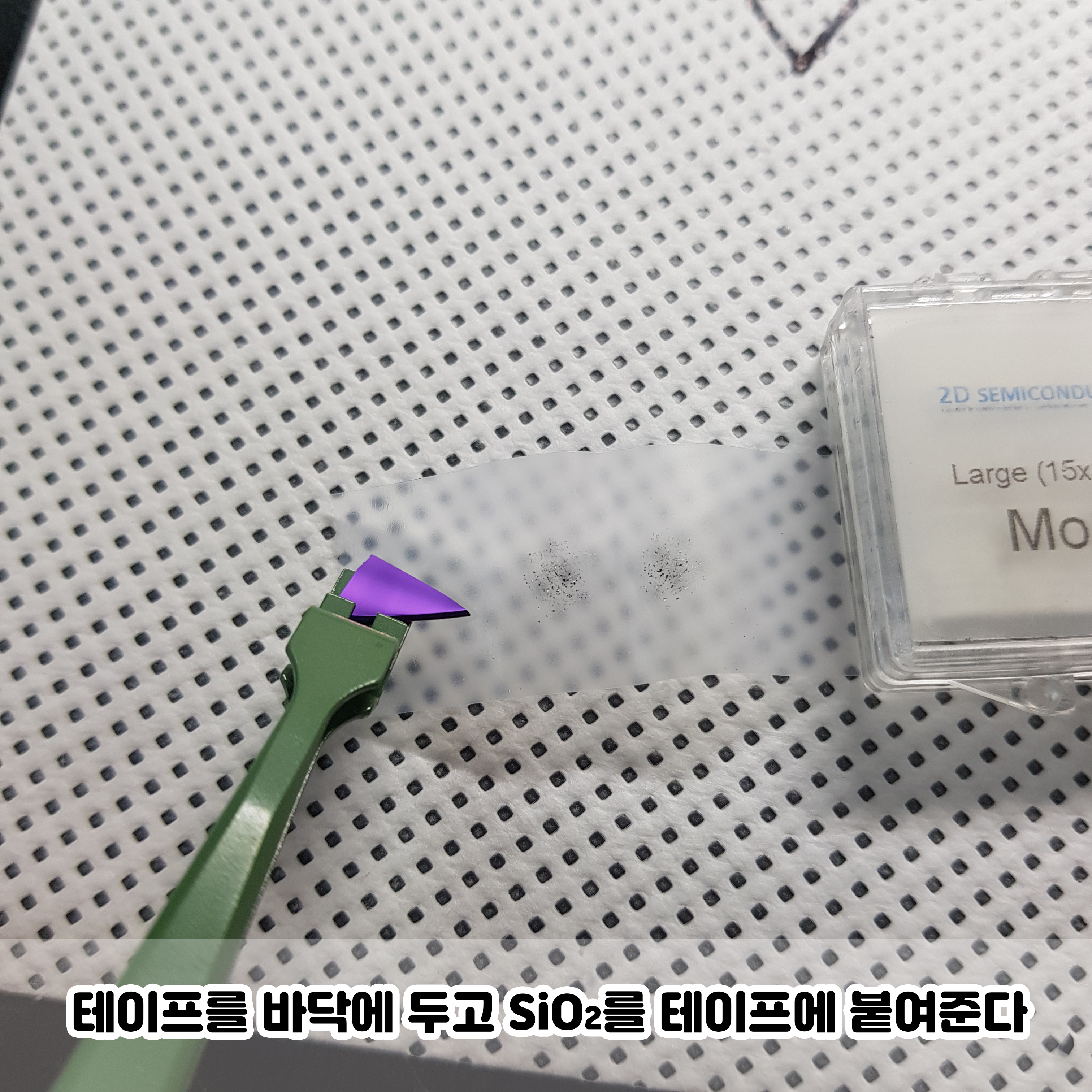 이제 테이프를 바닥에 두고 SiO2를 테이프에 붙여주세요. SiO2를 바닥에 두고 테이프를 붙여도 돼요.