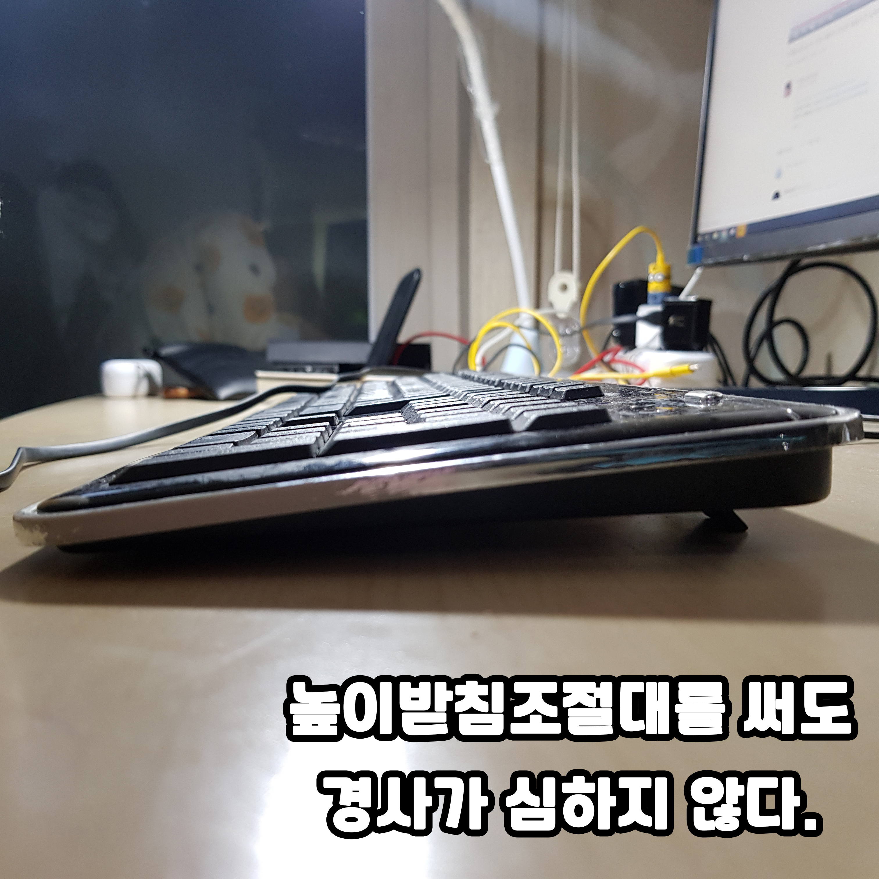 높이받침조절대를 써서 살짝 세워도 경사가 심하지 않아서 타자치는데 불편함은 없습니다.
