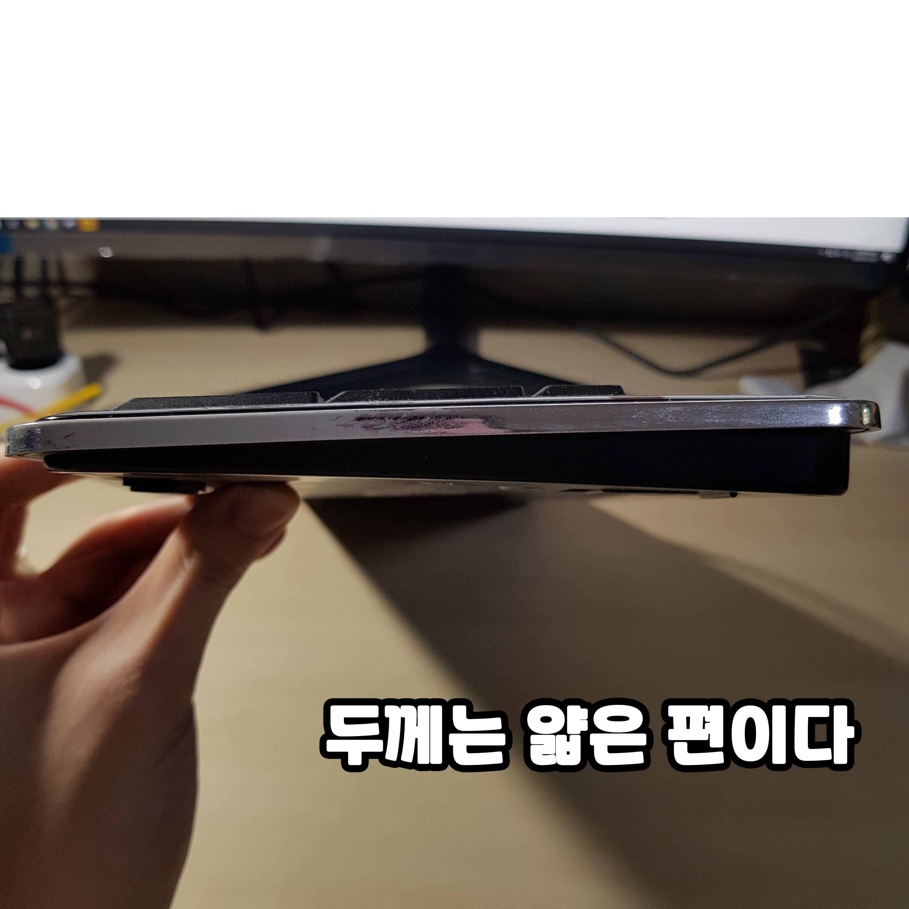 두께는 얇은 편이구요. 키보드의 크기는 45 * 15 cm라서 작은편이 아니에요. 두께도 한 2~3cm정도구요.