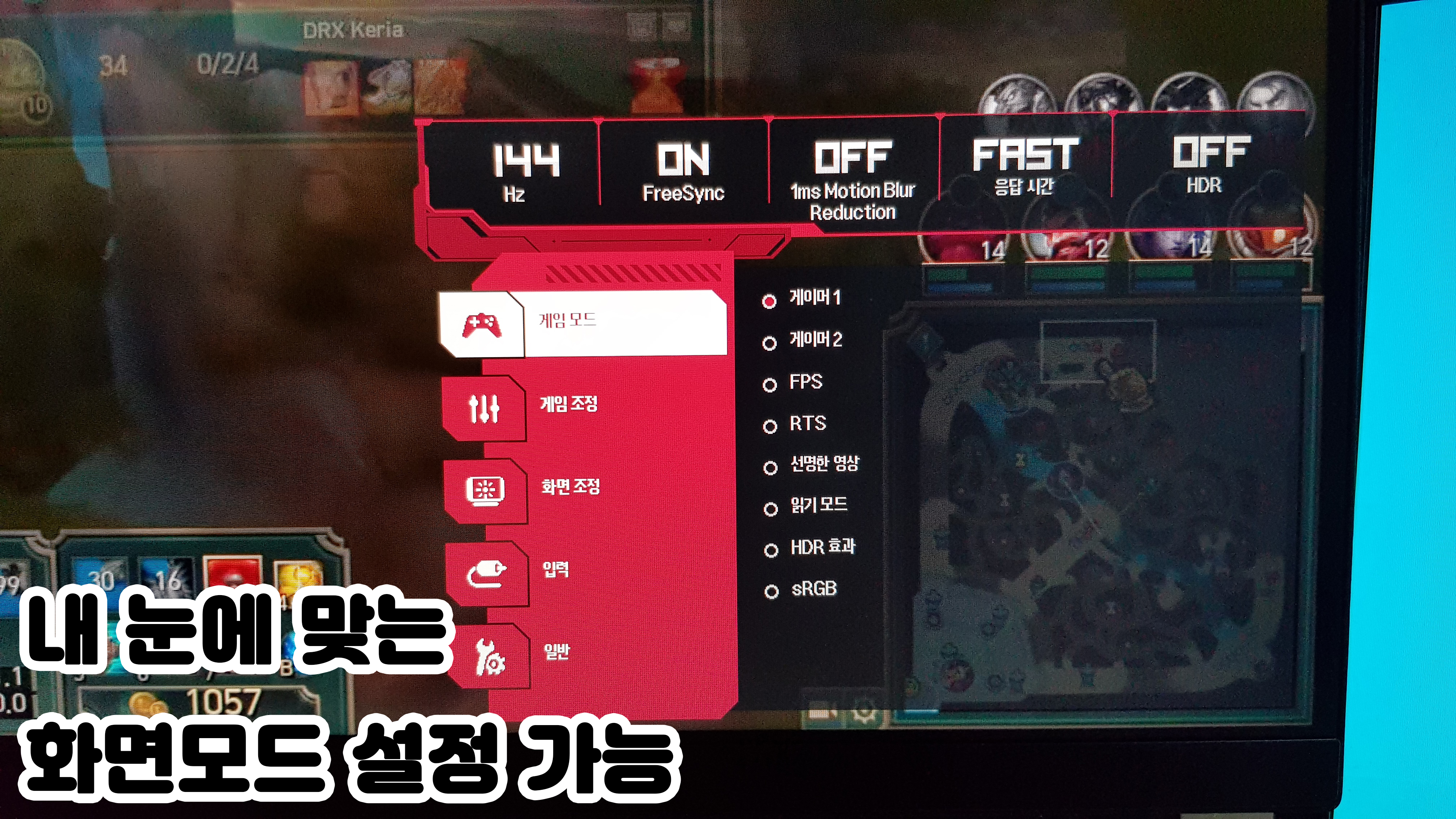 게이머모드와 HDR효과 극대화 모드, 영상감상 모드, FPS 모드 등등 다양한 설정이 있어서 때에 따라 바꿔서 쓸 수 있어요. 저는 주로 게이머 2 모드와 HDR 모드가 제 눈에 잘 맞아서 두가지 모드만 바꿔서 썼습니다.