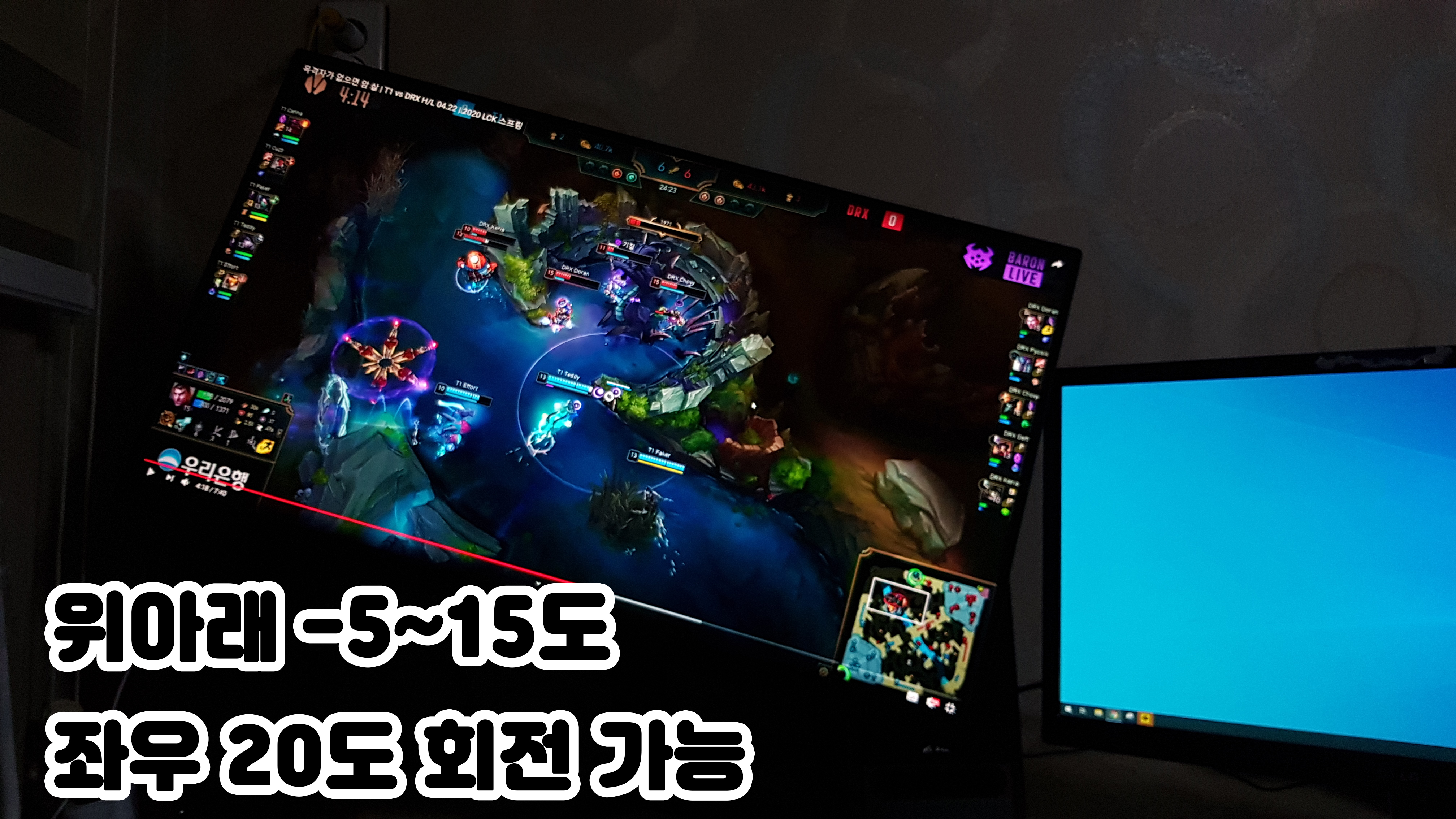 모니터를 살짝 아래로 구부려주면, 눈높이에 딱 맞게 세팅되구요. 광시야각도 178도라 화면에 이질감이 없습니다. 누워서 봐도 잘 보이는 수준이거든요~ㅋㅋㅋㅋ