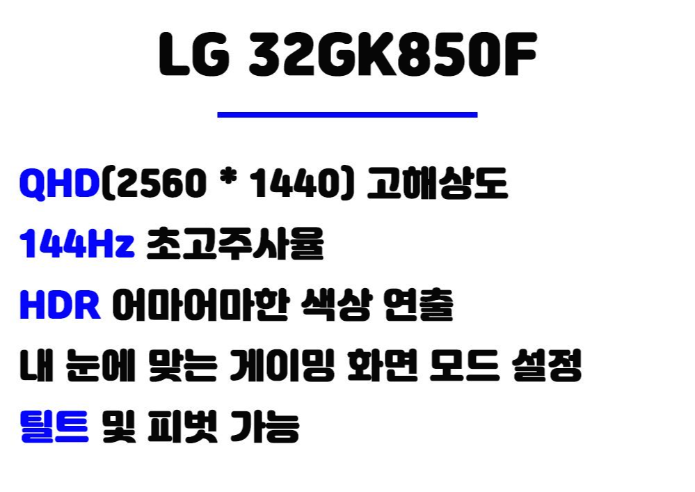 여러분들의 책상크기, 높이, 그래픽카드의 성능을 고려하셔서 32인치의 게이밍모니터를 구매해도 괜찮다 싶으시면 32GK850F도 살펴보면 좋을 것 같아요.