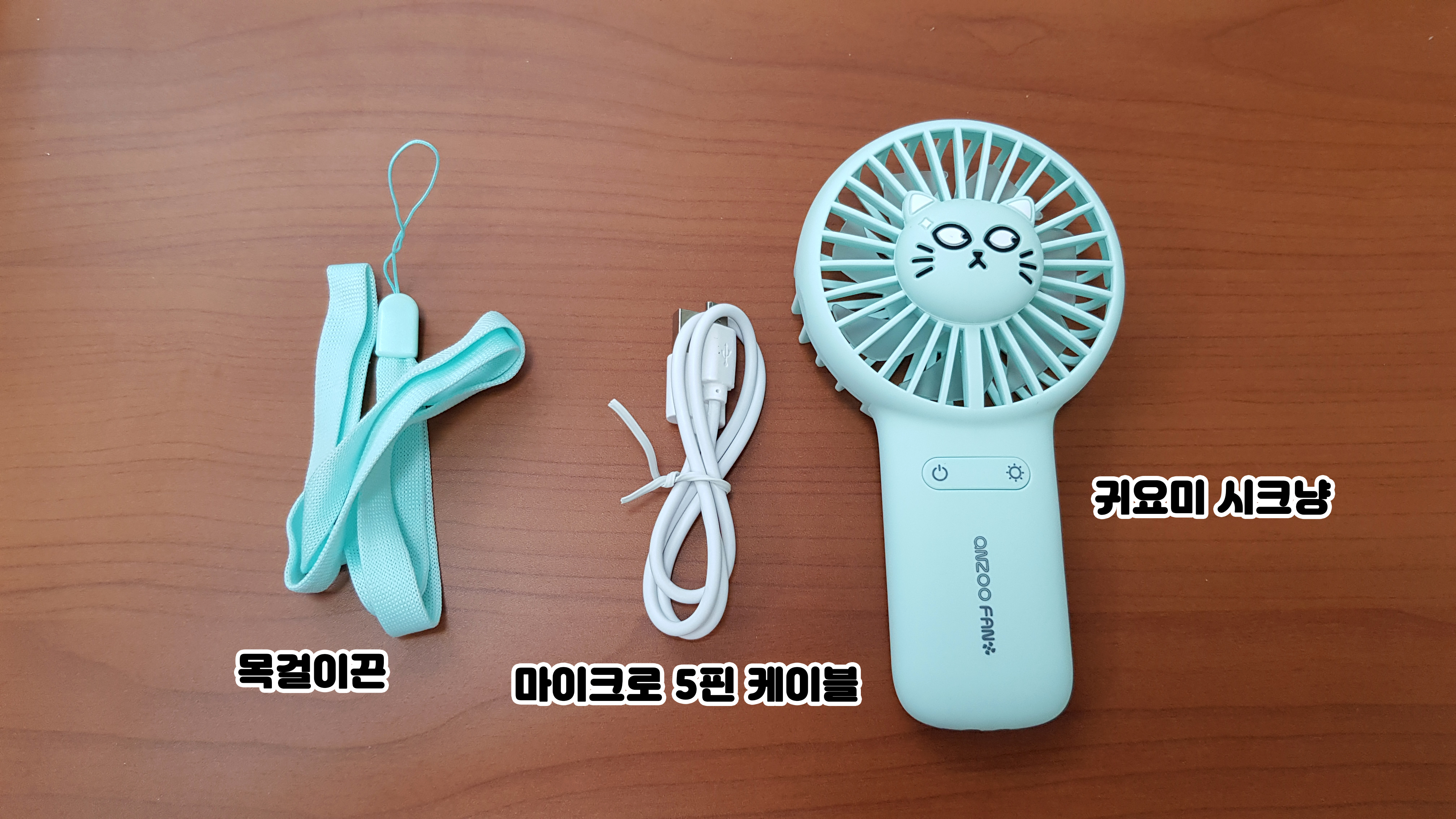 포장을 뜯으면 목걸이 스트랩과 마이크로 5핀 케이블, 미니선풍기 본체가 나옵니다.