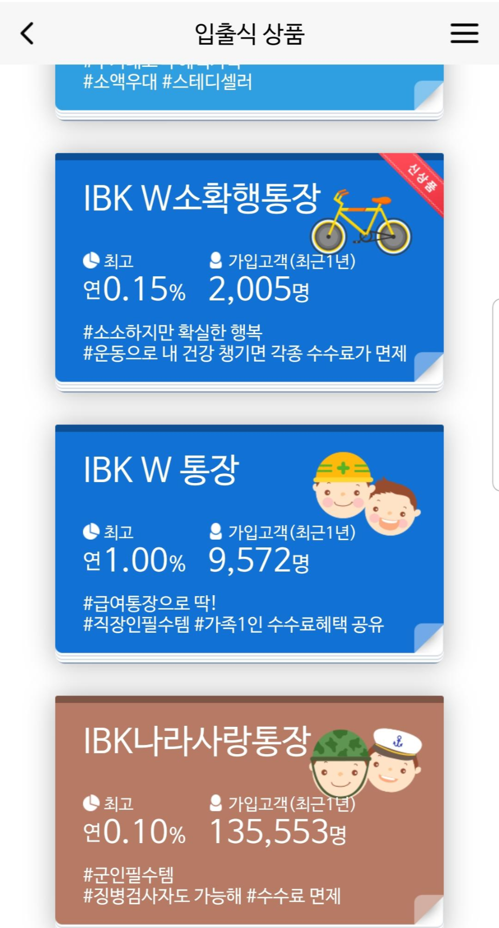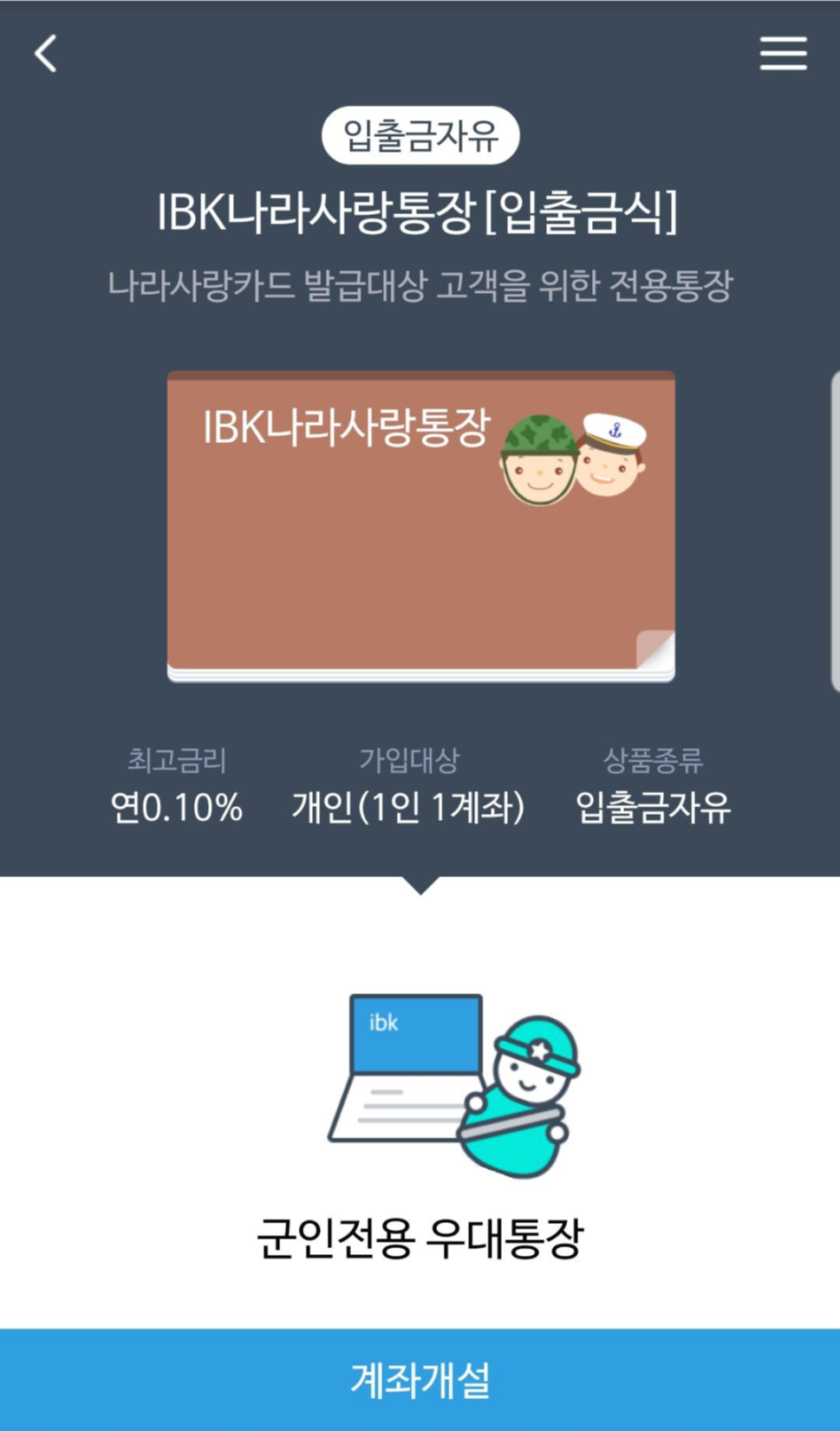 4가지 상품이 뜨실텐데, 그 중 제일 아래에 있는 IBK나라사랑통장을 선택해주세요.