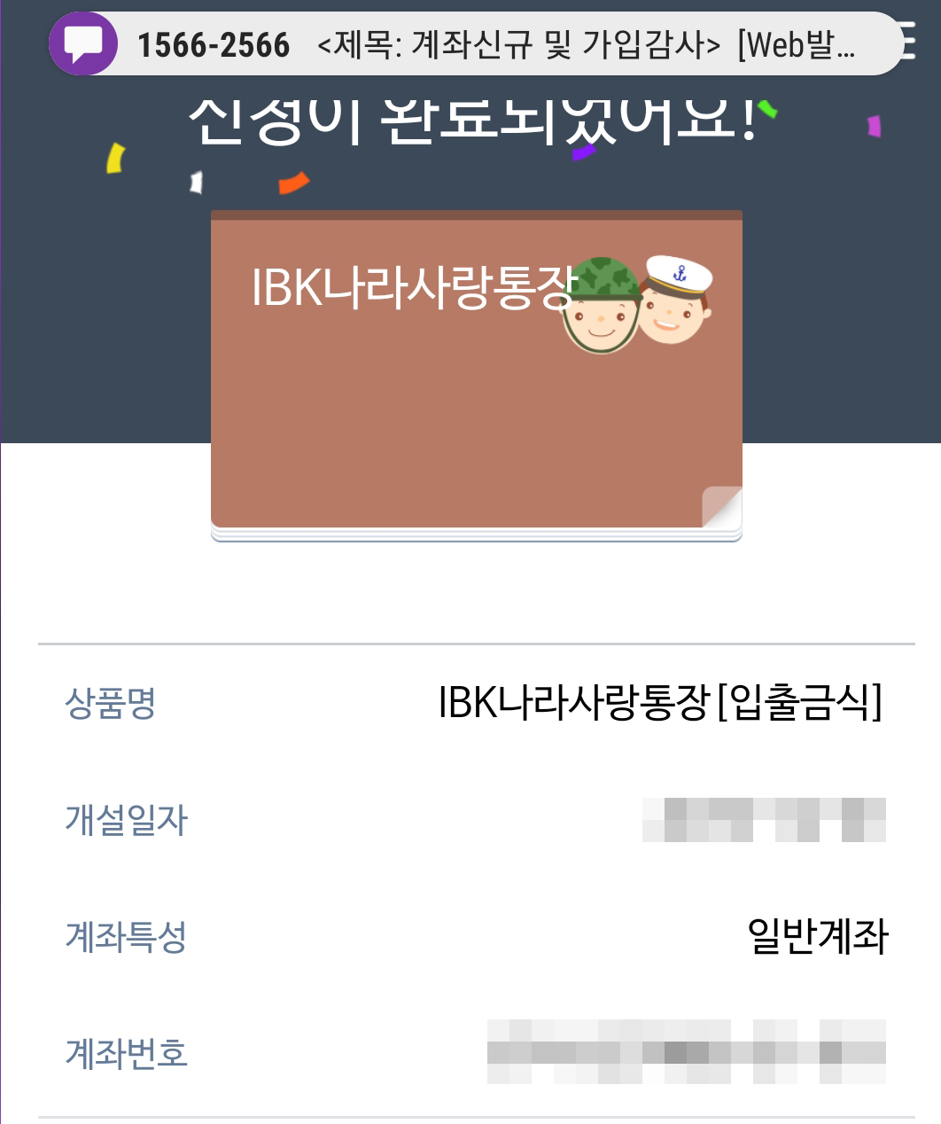 차근차근 요구하시는 것을 하다보면 IBK나라사랑통장이 개설됐다는 창이 뜹니다.