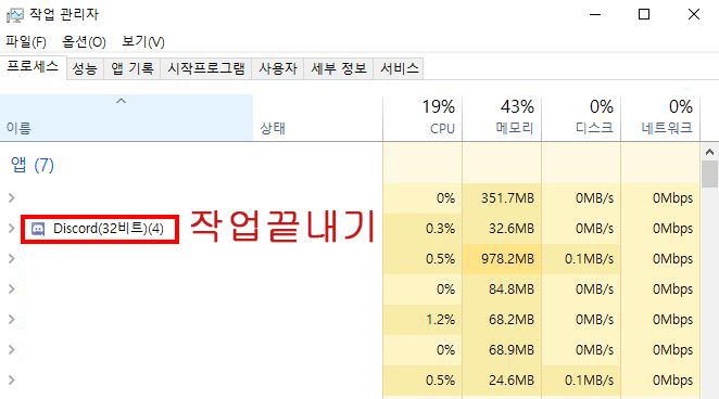 그럴 일은 없겠지만 삭제가 안될 경우가 있는데요. 이때는 디스코드와 관련된 프로그램이 전부 다 꺼졌는지 확인하시구요. 혹시나 안꺼졌다면 window10일 경우 ctrl+shift+esc, window 7이하일 경우 ctrl+shift+del를 눌러서 작업관리자 창을 열어주세요.그 다음 Discord를 찾아 작업끝내기를 해주세요.
