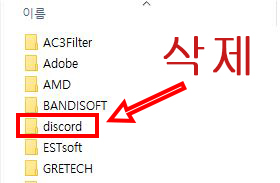 이번에는 방금보다 더 많은 폴더들이 보일텐데요. 신경쓰지마시고 Discord 폴더만 찾아주시면 됩니다. 이 폴더의 위치는 로컬디스크(C)-> 사용자 -> 사용자이름폴더 -> Appdata -> Local 입니다. 똑같이 삭제해주시면 총 2개의 폴더가 삭제됐어요!