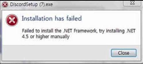 먼저 제일 답답한 오류인 디스코드 넷프레임워크 오류입니다. 자세히보시면 Failed to install the .NET Framework; 라고 적혀있죠? 넷프레임워크 설치에 실패했다는 뜻입니다. 뒷 문장을 해석해보니 넷프레임 4.5나 그 이상의 버젼을 깔아달라고 하네요.