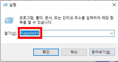 실행에 %appdata% 라는 글씨를 써준 뒤 확인버튼을 눌러줍니다.
