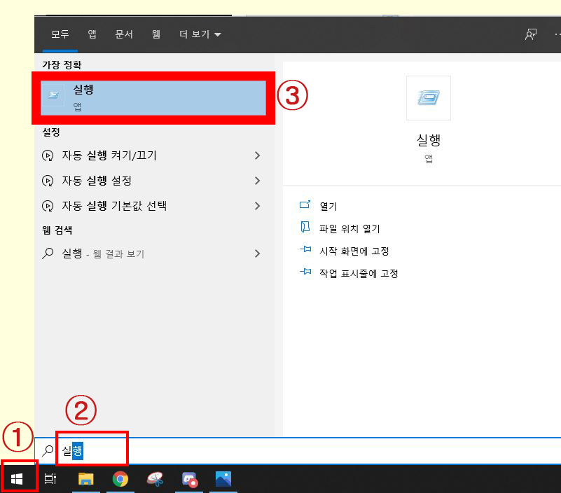 먼저 모니터 왼쪽 아래에 있는 window앱에서 '실행'을 타이핑으로 친 뒤 검색합니다. 그러면 바로 실행이라는 앱이 뜰거예요. 클릭해서 실행해줍니다.