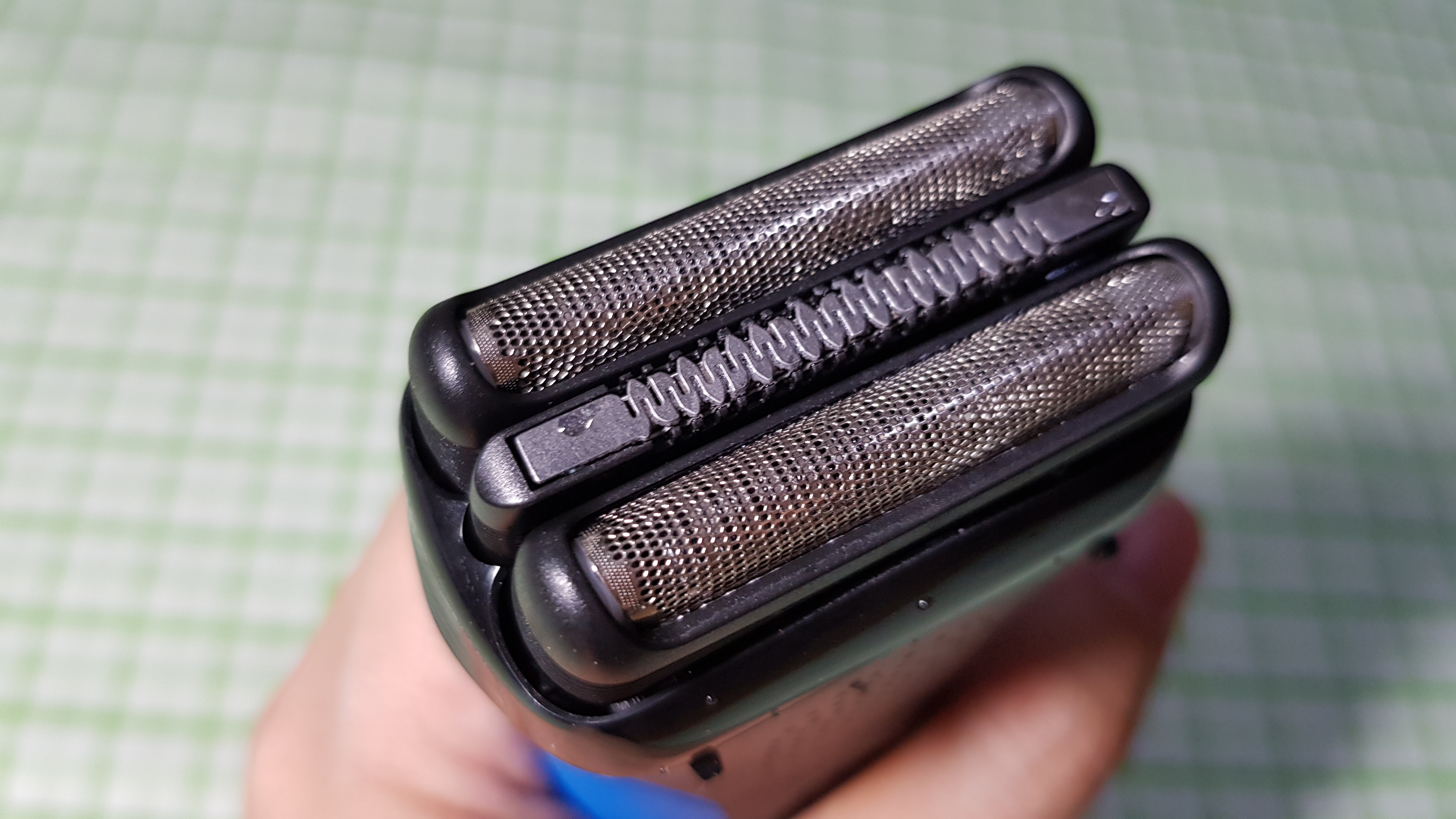 브라운 면도기는 기본 일자형 날입니다. 제가 쓰고 있는 제품은 310BT라는 제품이구요. 양쪽에 면도날망이 있고, 가운데는 수염을 모아주는 역할을 해요.