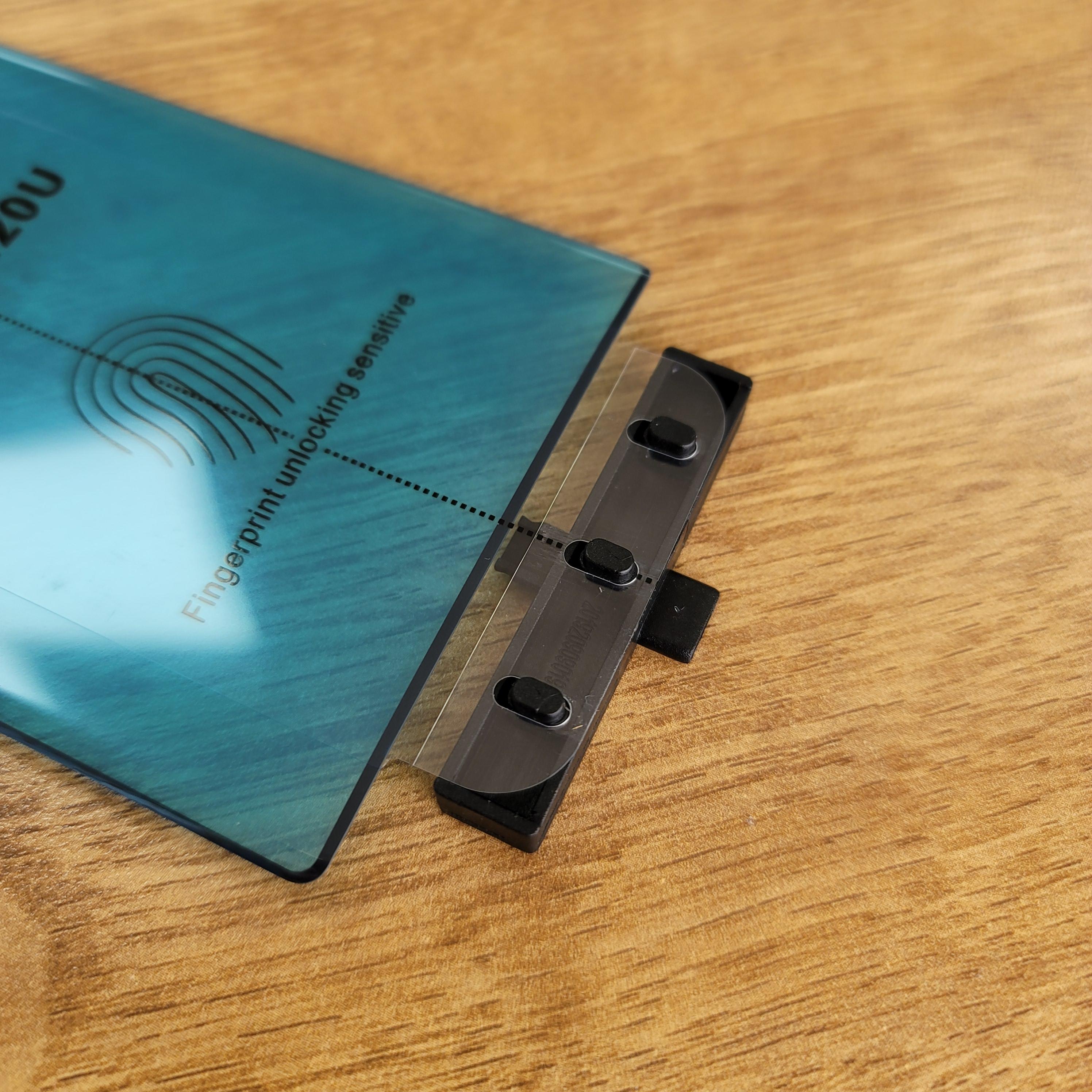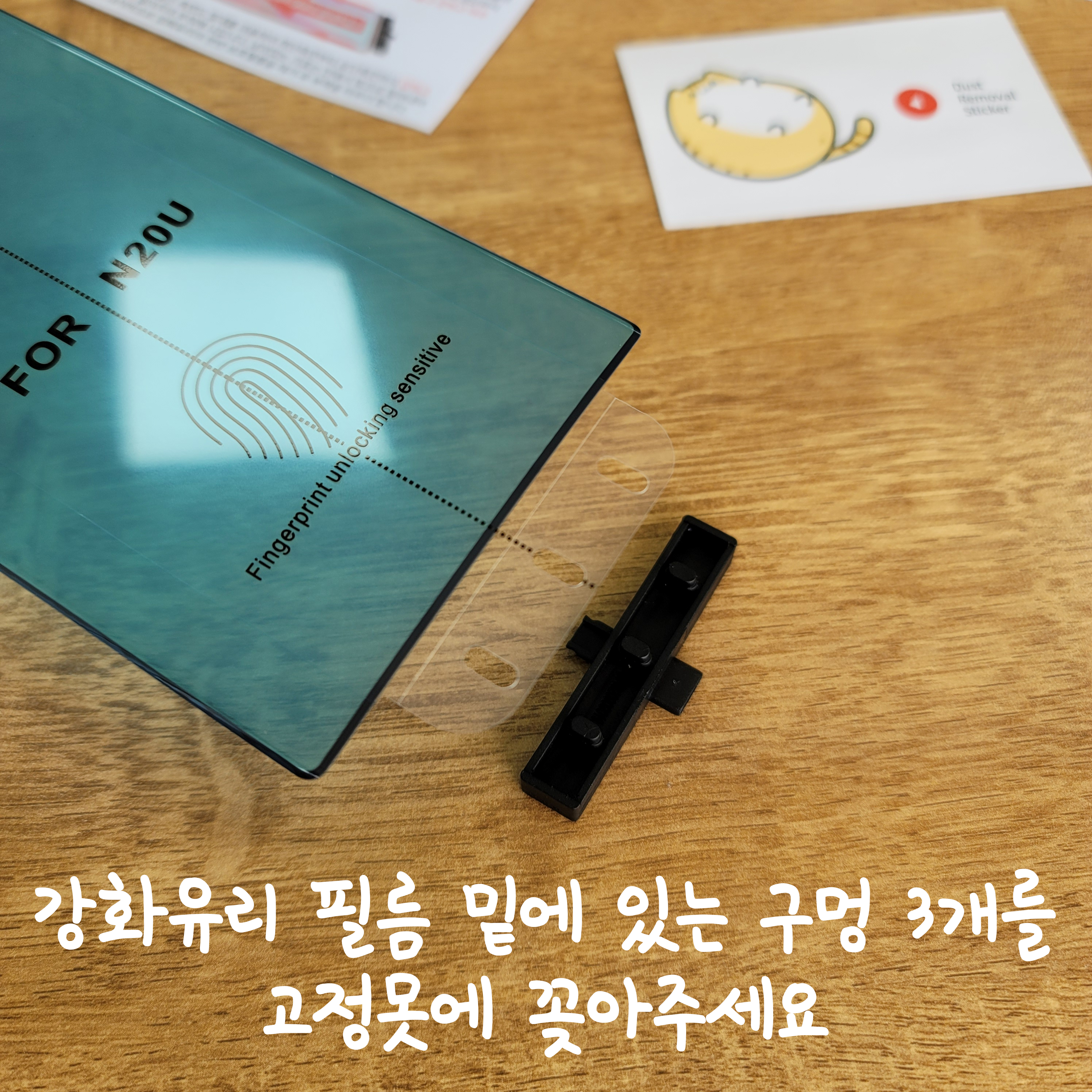 나머지 부품이 하나 있습니다. 얘도 구멍이 3개네? 아까 고정못에 맞게 껴줍니다. 이러면 노트20 울트라 강화유리필름이 움직이질 않아요. 조립 벌써 끝나버렸다~ 조립법 만만하쥬?