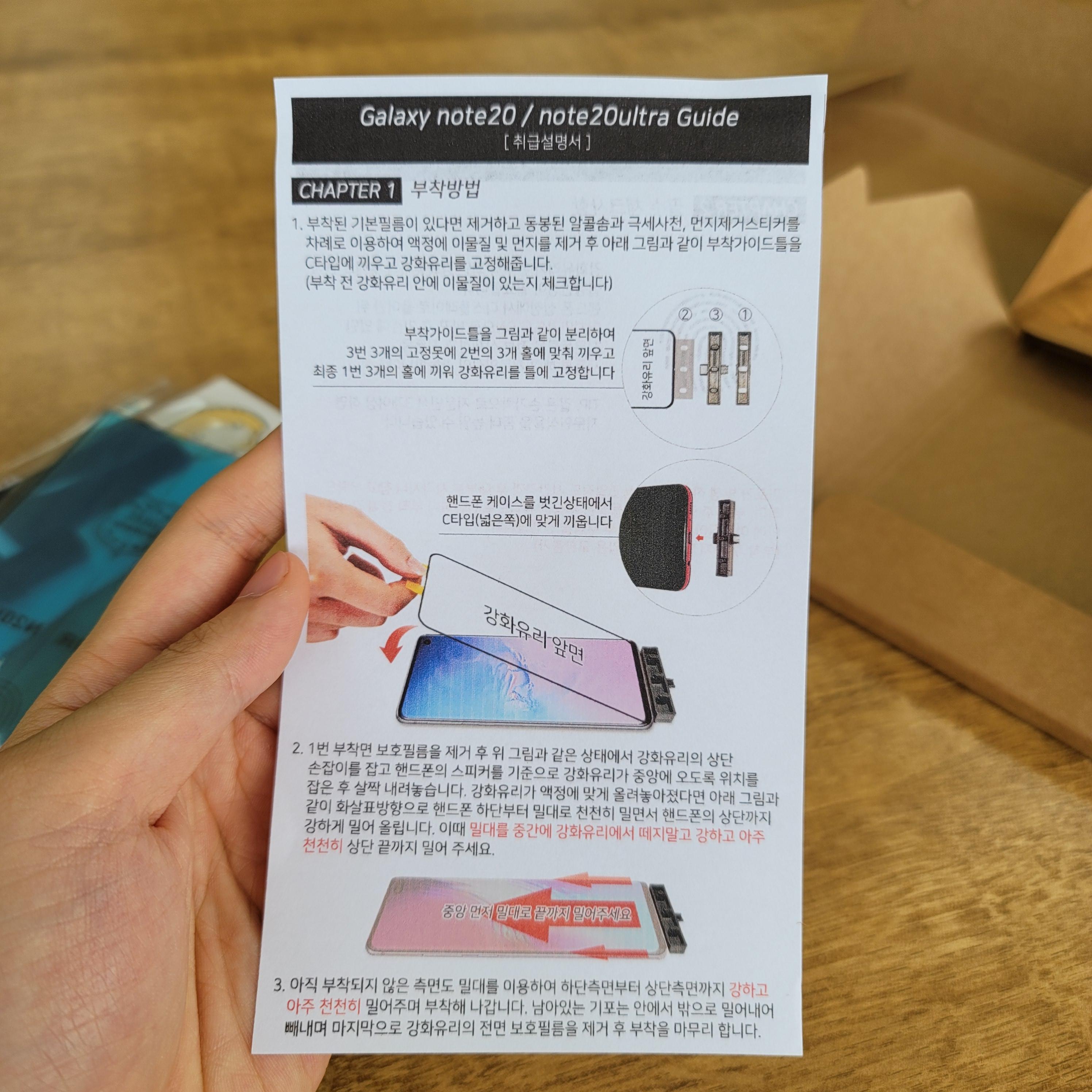 설명서 그림보면 바로 이해갑니다. 부착 고정툴을 스마트폰에 꽂은 뒤, 강화유리필름을 고대로 갤럭시 노트20 울트라에 내리면 위치에 맞게 부착된다. 엄청 간단하고 쉬워요.
