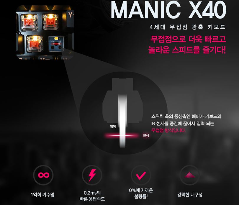 기계식 키보드 하면 적축 갈축같은 것만 생각나잖아요. 그런데 1~2년전 이들을 개무시하고자 태어난 기술이 광축 키보드입니다. 직접 누르는 방식이 아닌 IR 센서를 해머가 중간에서 끊음으로써 입력되는 방식이에요.
