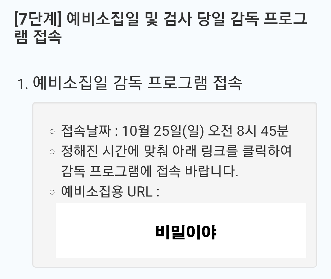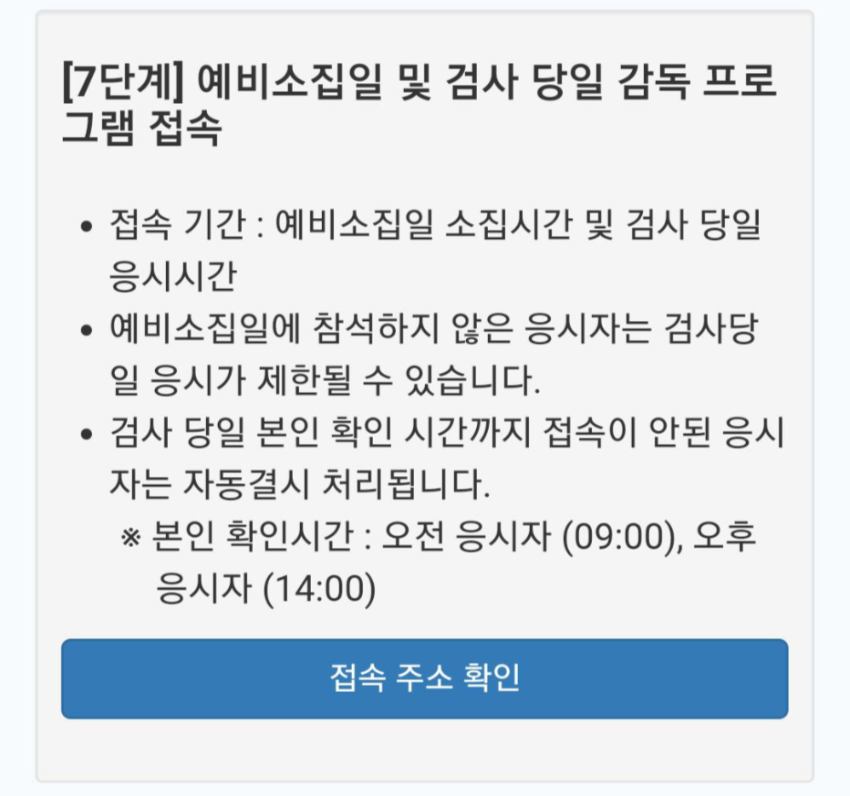 다시 주어진 주소를 키면 7단계에 접속 주소 확인이라고 있다. 여기 버튼을 키면 예비소집용 URL이 있다. 이 URL을 클릭하면 삼성직무적성검사 감독 프로그램으로 실행할 수 있다.