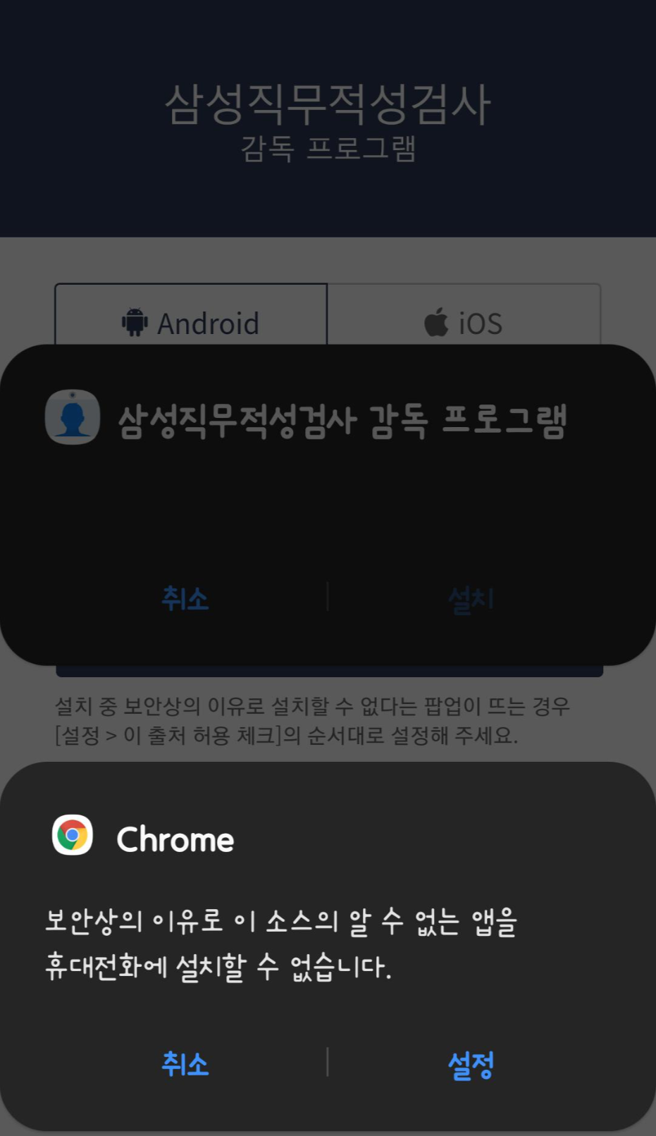 감독 앱 설치 페이지로 들어가니 주의 사항이 있네? 설치 중 보안상의 이유로 설치가 안된다면 뭐 하랜다. 안드로이드 버젼 다운로드를 누르니 apk형식의 파일이 깔렸다. 실행했다. 역시나 나도 이 오류창이 떴다.