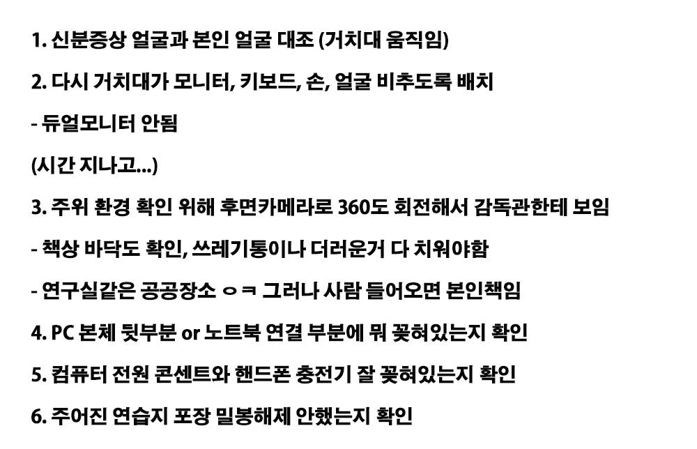 한 9시 20분 부터 신분증상 얼굴과 본인 얼굴을 대조하고 다시 가만히 있는다. 중간에 듀얼모니터쓰는 사람도 있는데, 듀얼모니터는 안되니 꺼야한다.
