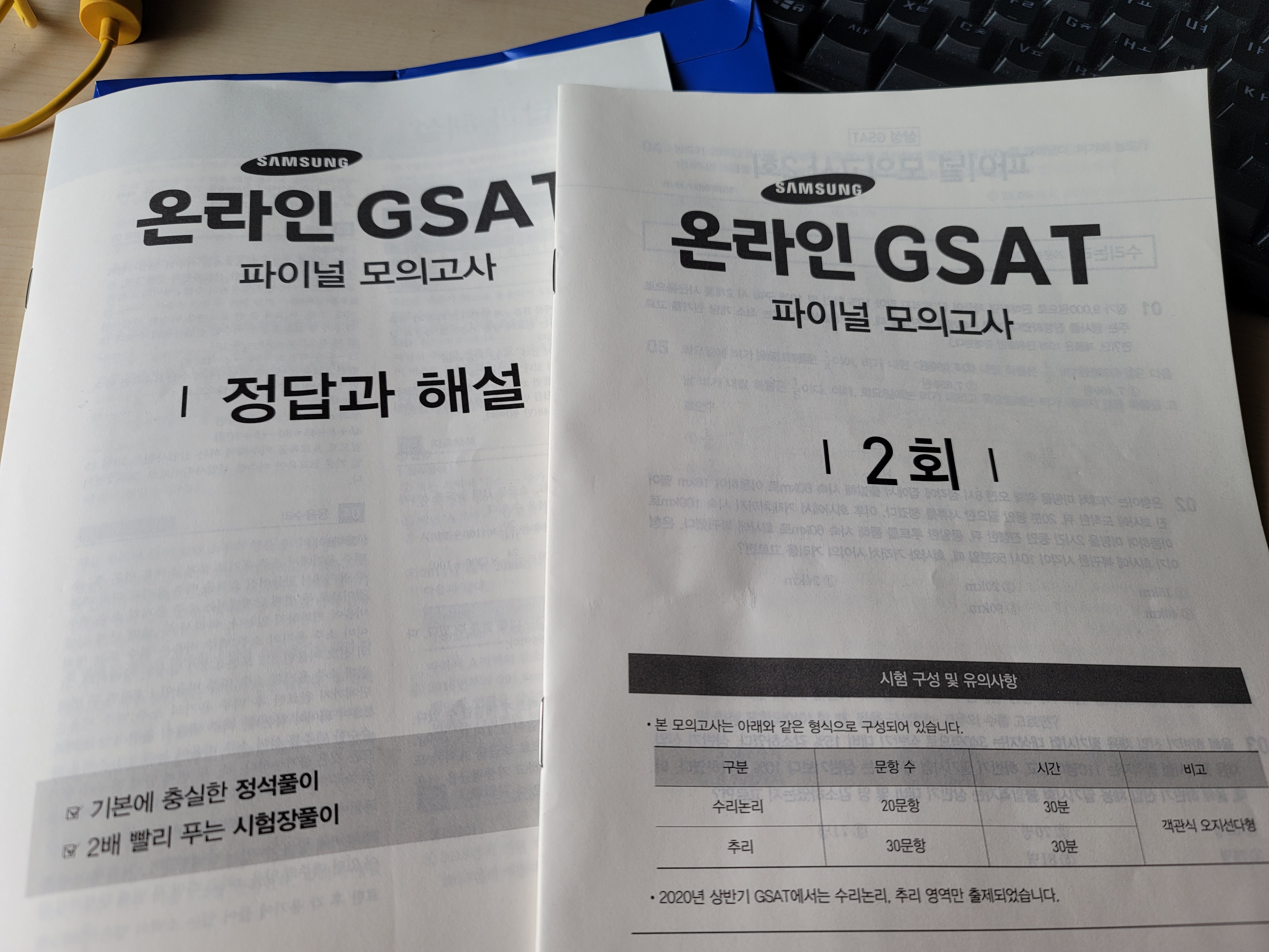 원래는 최신기출유형만 풀고 삼성 직무적성검사 응시하려고했는데, 온라인으로 바뀌고 나서 시간이 너무 남는다. 서류 결과 발표부터 GSAT까지 3주정도 시간이 뜬다. 그래서 마지막에 누가 중고로 에듀윌 봉투모의고사 5000원에 팔길래 2회분 샀다.