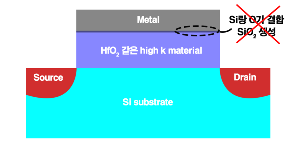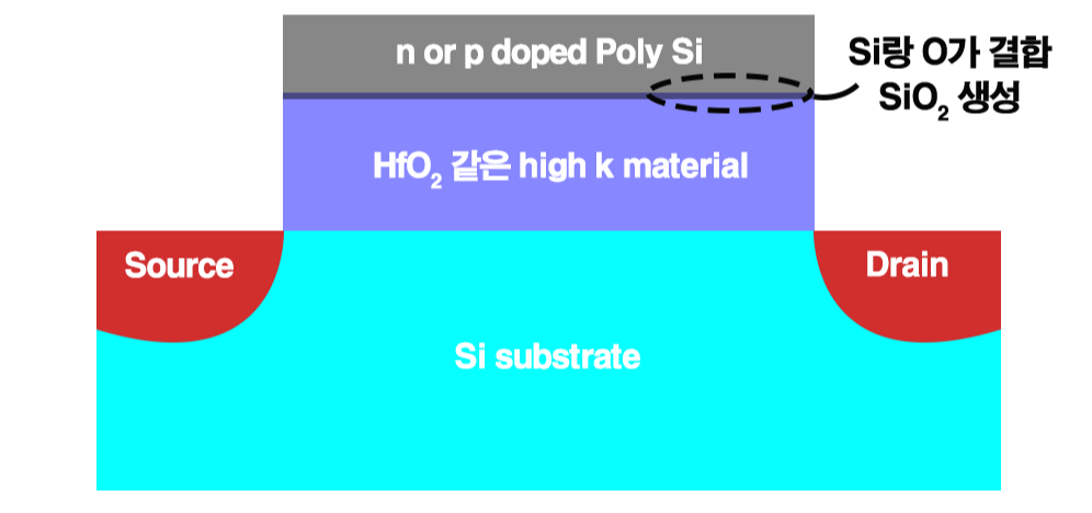근데 위 구조 그림 보세요. HfO2 같은 high k로 gate oxide가 바뀌었을 때는 다릅니다. gate의 Poly-Si와 HfO2가 만나봐. Si랑 O가 접촉하는 부분 무조건 있겠죠. 눈 맞는 거야. 눈 맞아서 SiO2 형성하는 거야. 아니 원래는 HfO2 있어야 할 자리인데 SiO2도 같이 생긴 거야.