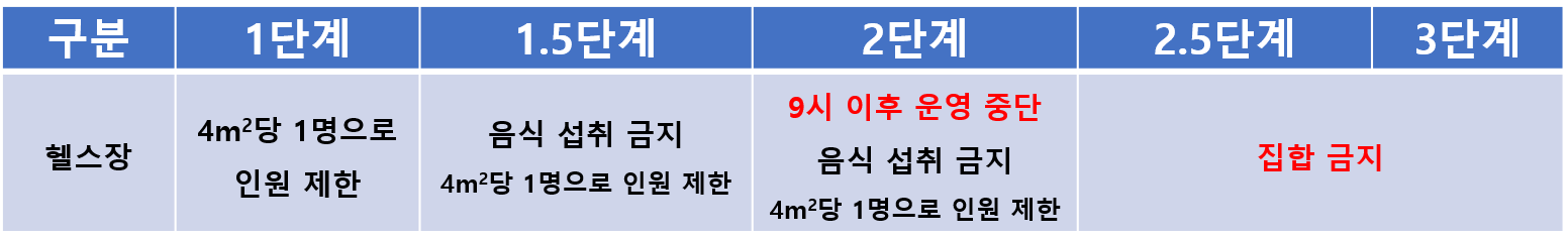 헬스장의 경우 2.5단계에서도 영업 가능합니다. 오후 9시까지구요. 마찬가지로 오후 9시부터 오전 5시까지 새벽 영업 안됩니다. 지켜지지 않지만 샤워장은 항시 안됩니다. 안에서 음식섭취 안됩니다. 마스크는 항상 착용하고 있어야돼요.