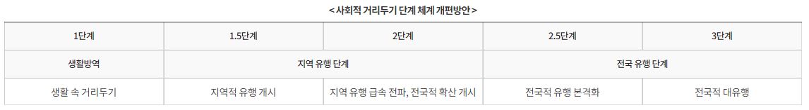 2.5 단계 : 주 평균 일일 확진자 수가 전국 기준 400~500명 이상 될 경우, 확진자 수가 매일 2배씩 증가하는 더블링 현상 발생할 경우 2.5단계로 격상합니다.