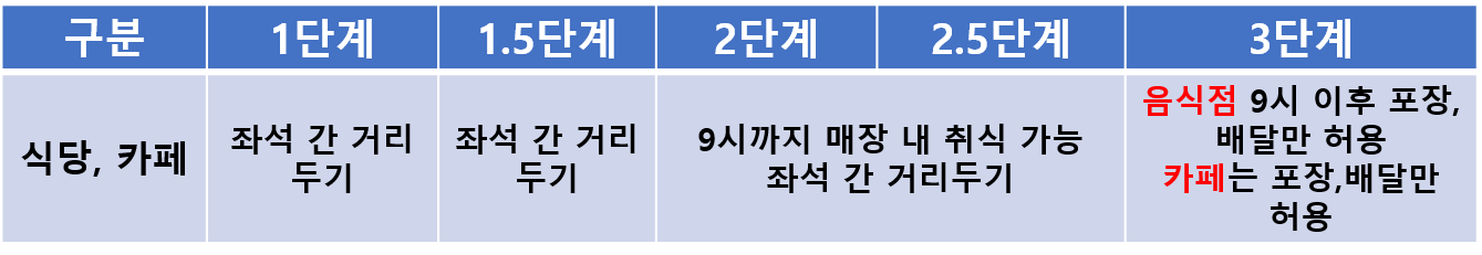 식당 카페는 1.5단계까지 칸막이 설치나 좌석 간 거리두기 같은 방역수칙을 잘 지키면 돼요. 하지만 2단계에서부터 음식점은 9시 이후 실내 영업 안되구요. 포장, 배달만 허용됩니다.