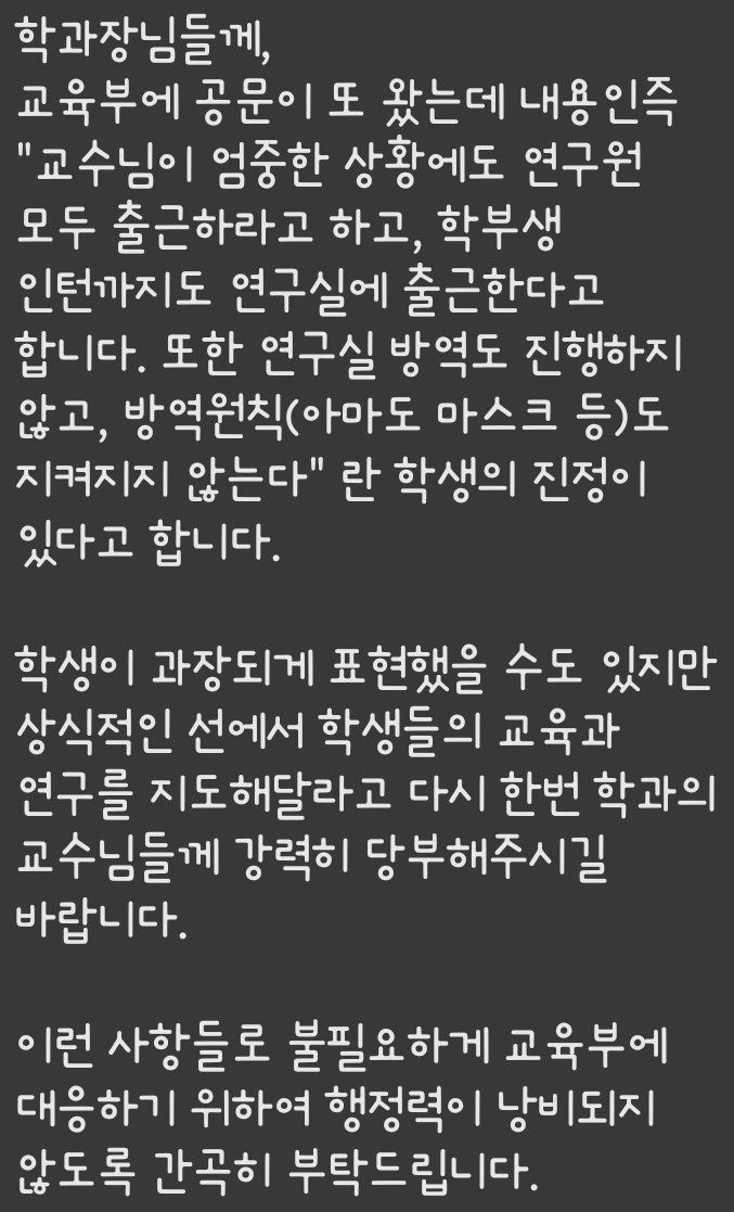 아마 대학원발 집단감염이 일어나지 않는 이상 대학원의 근무환경은 바뀌는 것 없을 것이다. 돈 벌어야하거든.