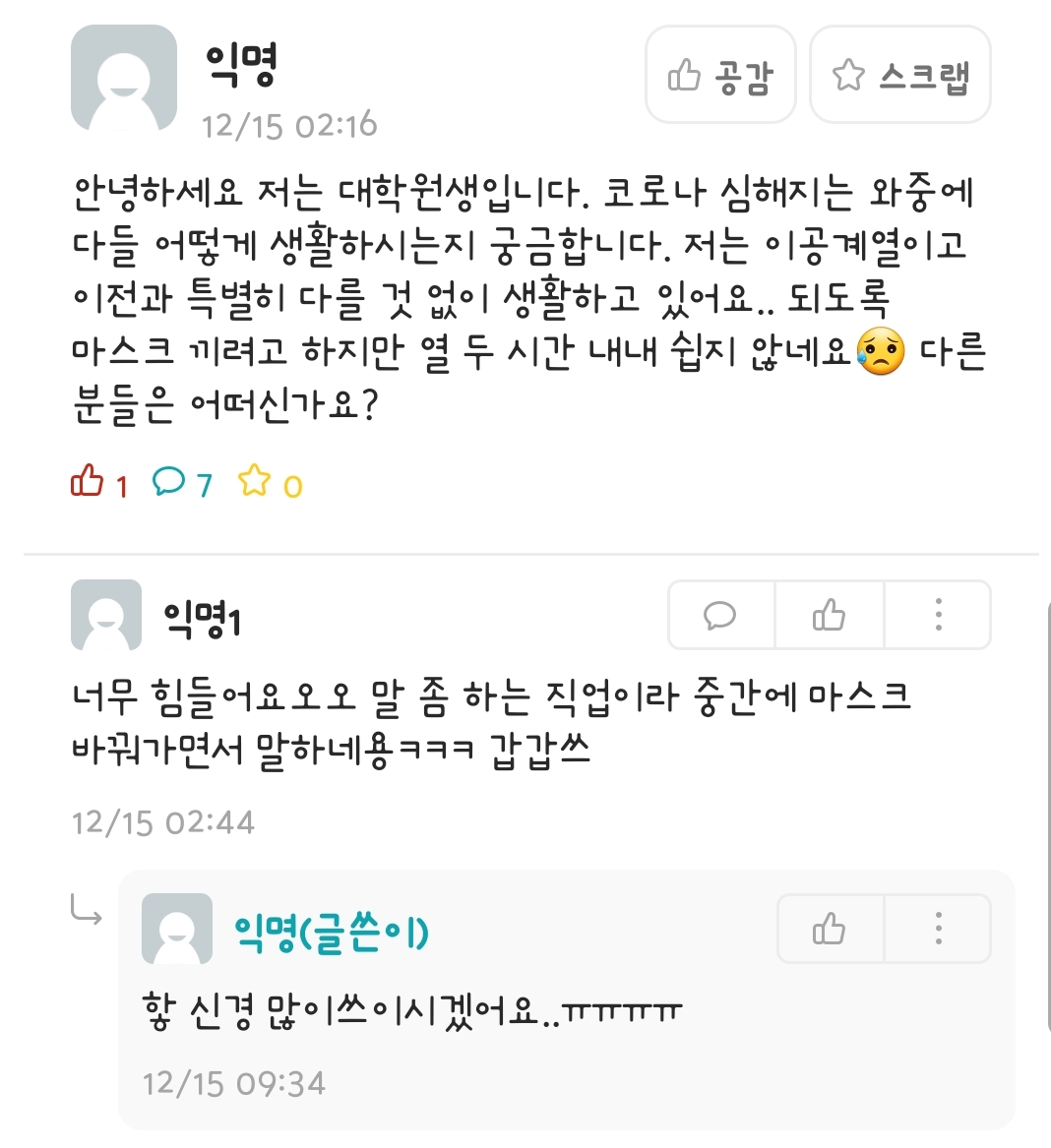 나는 개인적으로 재택근무 못하는 것에 불만없다. 실험하는게 더 중요하기 때문. 결과가 너무 궁금해서 빨리빨리 실험을 끝내고 싶어. 그리고 우리 학교 근처는 코로나 확진자가 그렇게 많지 않아서 크게 걱정되지 않는다.
