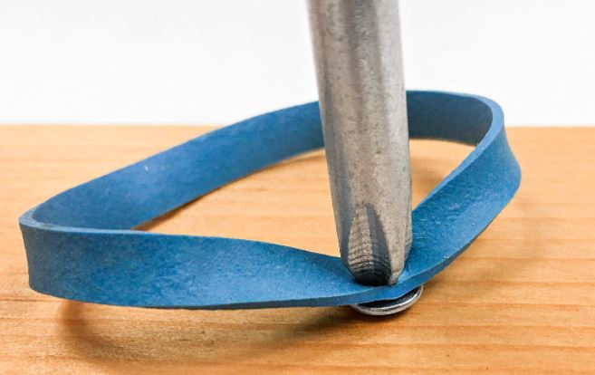 위 사진처럼 두꺼운 고무줄 말고요. 치킨이나 배달음식 시키면 무조건 하나씩 나오는 노랑색 고무줄 있죠?? 걔네를 이용하는겁니다. 걔네를 나사 홈에 대세요. 그렇게 겹친 상태에서 드라이버를 꽂아 넣으세요.