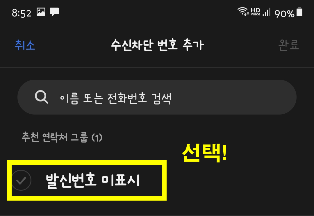 안에 들어가시면 발신번호 미표시라는 항목이 있어요. 이걸 선택하신 뒤 완료버튼 누르면, 발신번호 표시제한으로 걸려온 전화들 있죠?? 다 차단됩니다. 진짜 간편하죠??