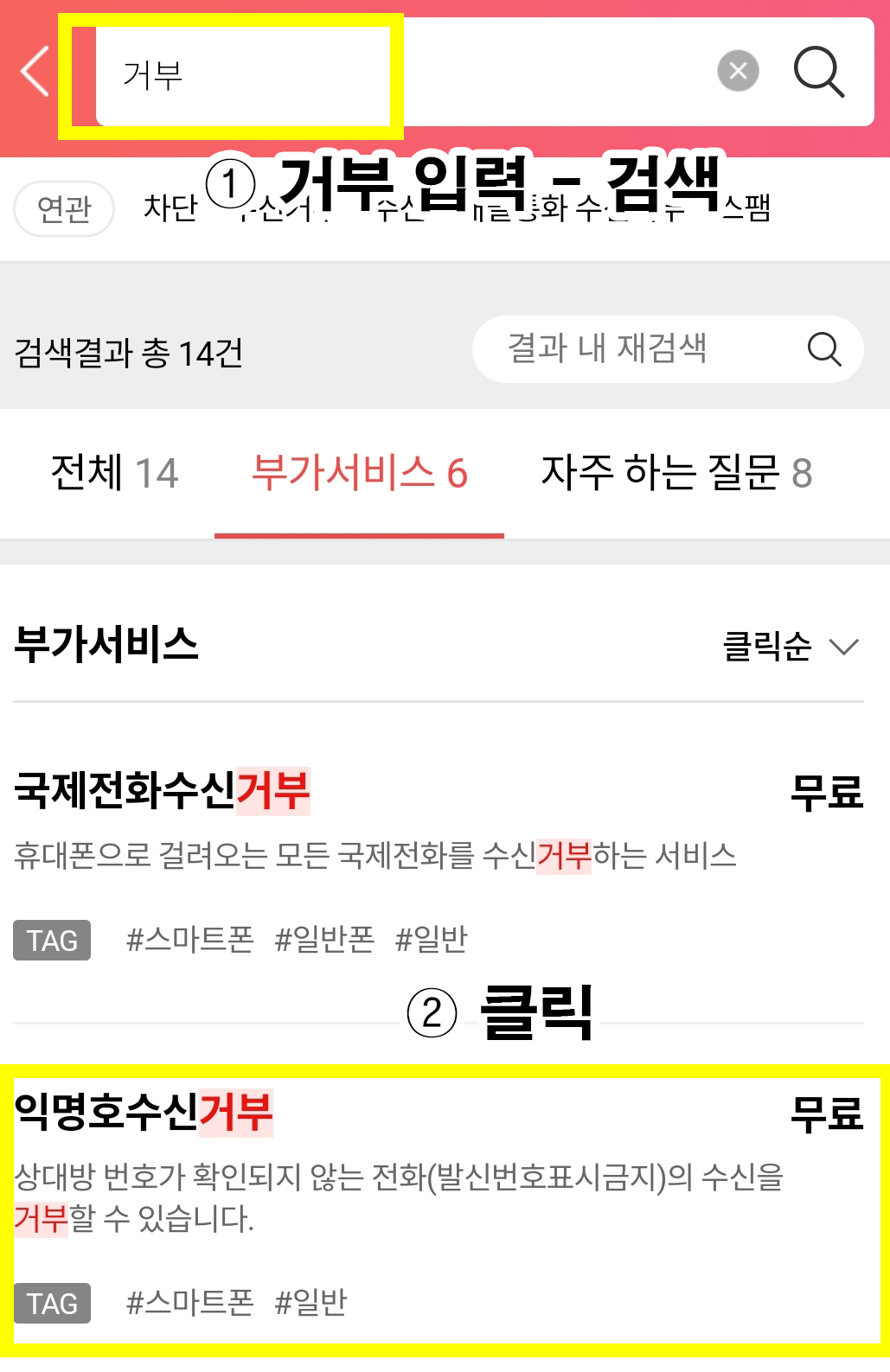 그러면 익명호수신거부라는 부가서비스가 보입니다. 이 서비스가 우리의 해답이예요 클릭!