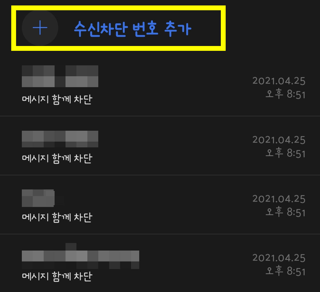 위쪽에 수신차단 번호 추가라는 버튼이 있습니다. 클릭해주세요. 잡담이지만 와 저도 보니까 진짜 광고 번호들 차단 많이해놨네 ㅋㅋㅋㅋ